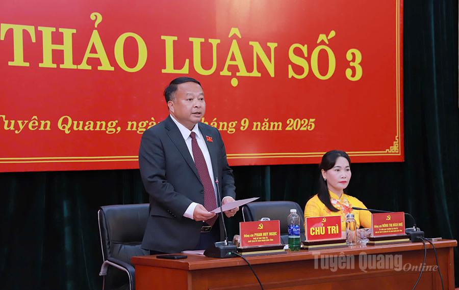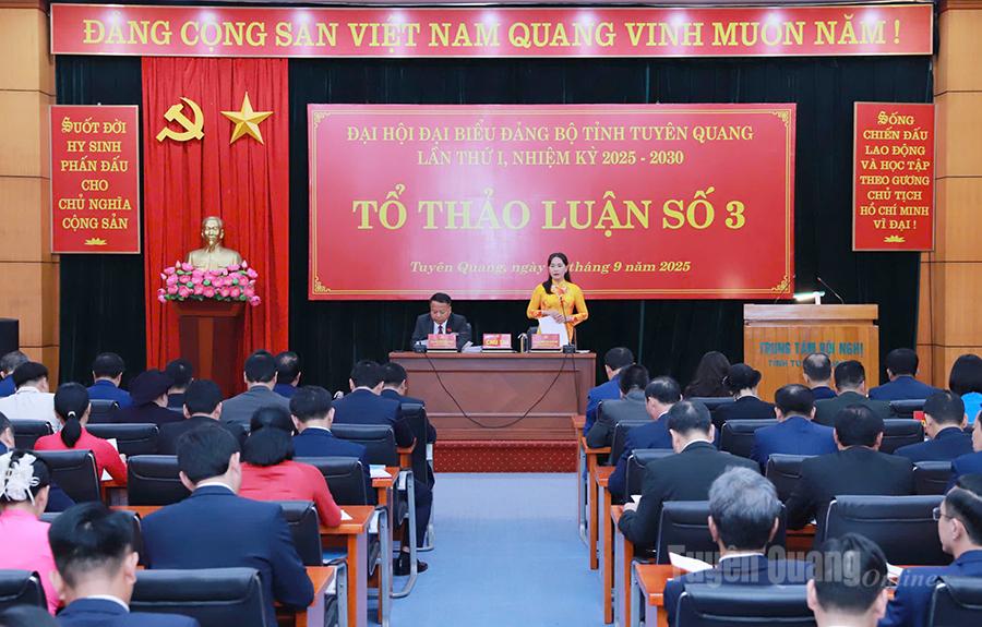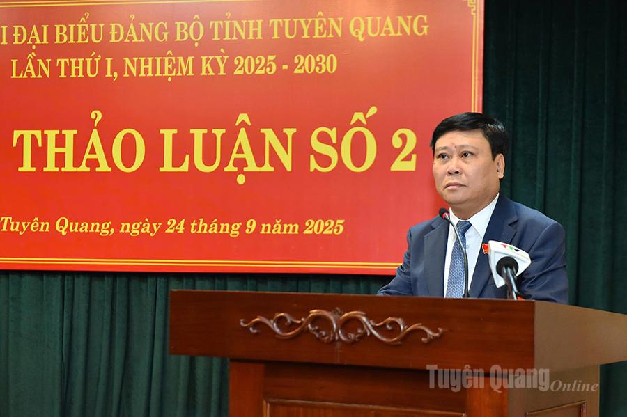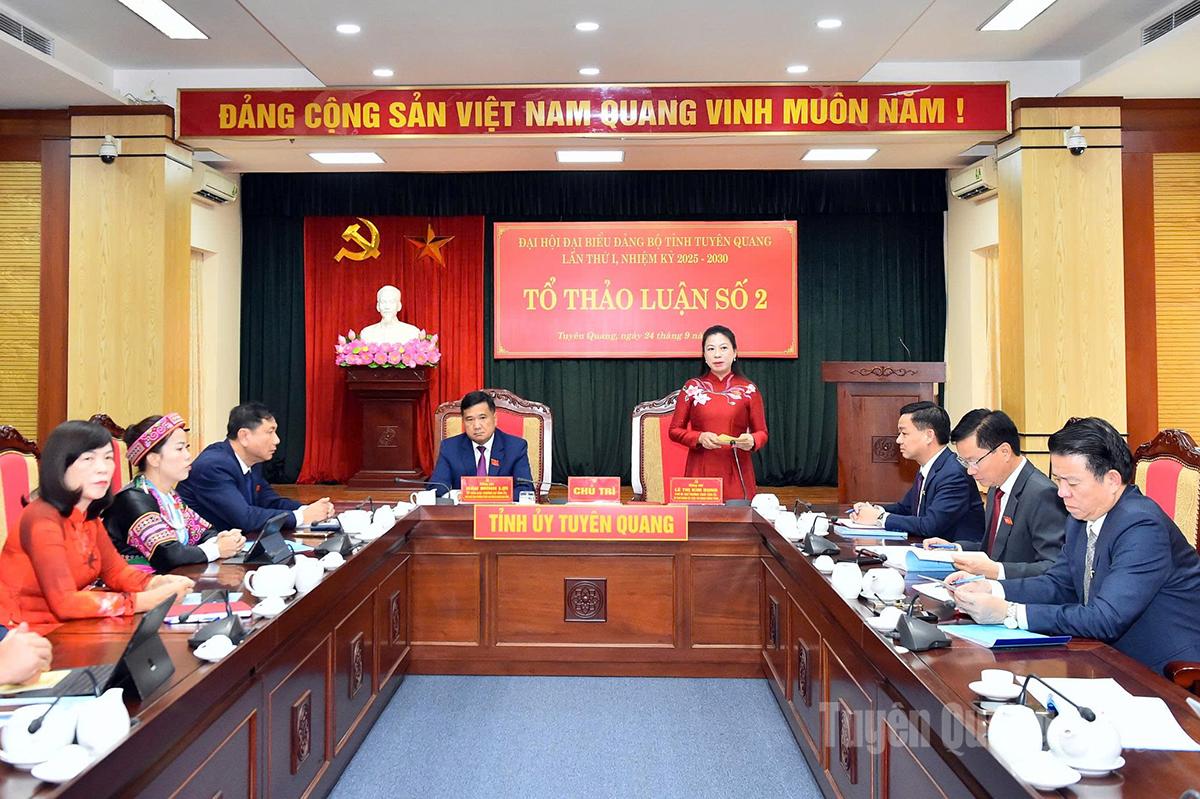 Đại biểu thảo luận về 9 vấn đề trọng tâm trong công tác xây dựng Đảng, tổ chức bộ máy, cán bộ và thúc đẩy phát triển kinh tế - xã hội như: Tham mưu sắp xếp tổ chức bộ máy các cơ quan, đơn vị, địa phương đảm bảo tinh gọn, hoạt động hiệu năng, hiệu lực, hiệu quả; phát triển sản xuất nông, lâm nghiệp, hàng hóa theo chuỗi liên kết, đẩy mạnh ứng dụng khoa học công nghệ nhằm nâng cao chất lượng, giá trị, hiệu quả bền vững ngành Nông nghiệp và Môi trường tỉnh Tuyên Quang đến năm 2030; một số giải pháp đẩy mạnh ứng dụng khoa học, công nghệ và chuyển đổi số trên địa bàn tỉnh luyên Quang - động lực then chốt cho phát triển nhanh và bền vững; khai thác tiềm năng, lợi thế để đẩy mạnh phát triển du lịch trở thành ngành kinh tế quan trọng của tỉnh; một số giải pháp phát triển giáo dục và đào tạo bền vững trên địa bàn tỉnh Tuyên Quang, giai đoạn 2025-2030; nâng cao chất lượng công tác bảo vệ, chăm sóc sức khỏe cho nhân dân; nâng cao chất lượng sinh hoạt cấp ủy, chi bộ và xây dựng chi bộ "4 tốt"; giải pháp triển khai thực hiện các chính sách dân tộc, tôn giáo trong tình hình mới; xây dựng tố chức cơ sở Đảng trong sạch, vững mạnh ở các chi bộ vùng biên giới.