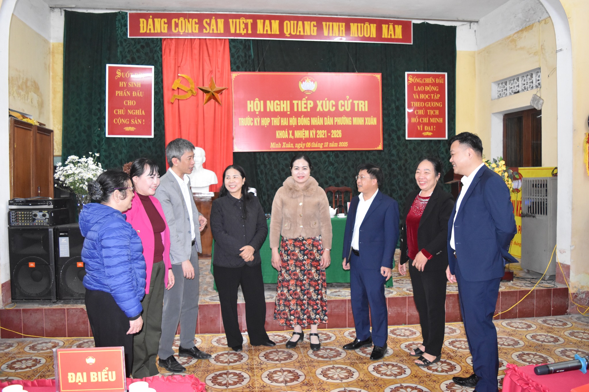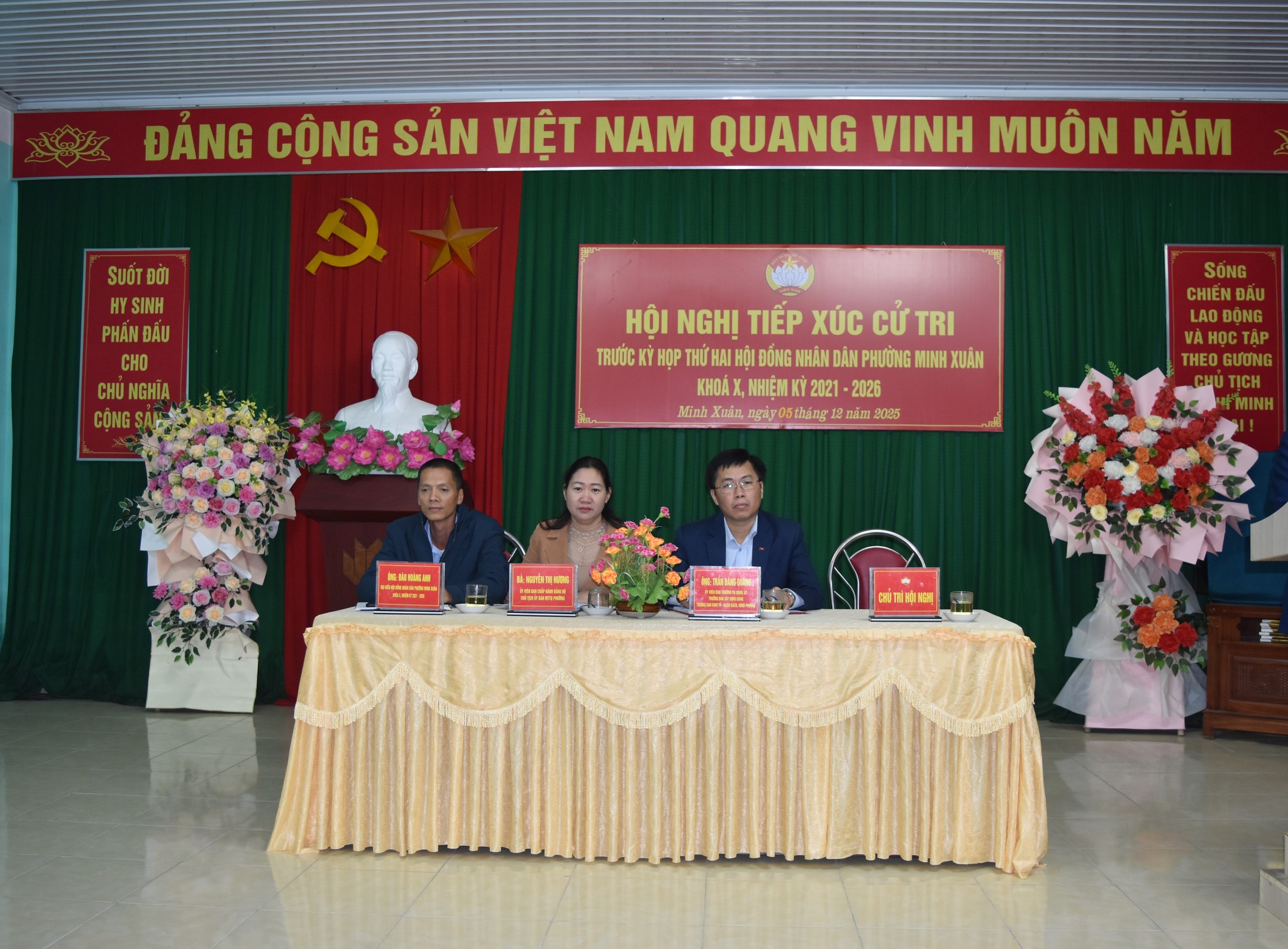 Phát biểu tại buổi làm việc, các đồng chí Bùi Minh Ngọc, Ủy viên Ban Thường vụ Đảng ủy, Phó Chủ tịch Hội đồng nhân dân phường Minh Xuân; Trần Đăng Quang, Ủy viên Ban Thường vụ Đảng ủy, Trưởng Ban Xây dựng Đảng Đảng ủy phường Minh Xuân, thay mặt tổ đại biểu số 5 và tổ đại biểu số 6, HĐND phường Minh Xuân ghi nhận, đánh giá cao các ý kiến, kiến nghị của cử tri. Đồng thời trao đổi, làm rõ thêm một số nội dung cử tri kiến nghị, đề xuất thuộc thẩm quyền. Đối với những ý kiến, kiến nghị thuộc thẩm quyền của phường, tổ đại biểu HĐND phường nghiêm túc tiếp thu, tổng hợp để trình tại Kỳ họp thường lệ cuối năm 2025, HĐND phường Minh Xuân, nhiệm kỳ 2021-2026 và chuyển các cơ quan có thẩm quyền xem xét, giải quyết theo quy định.