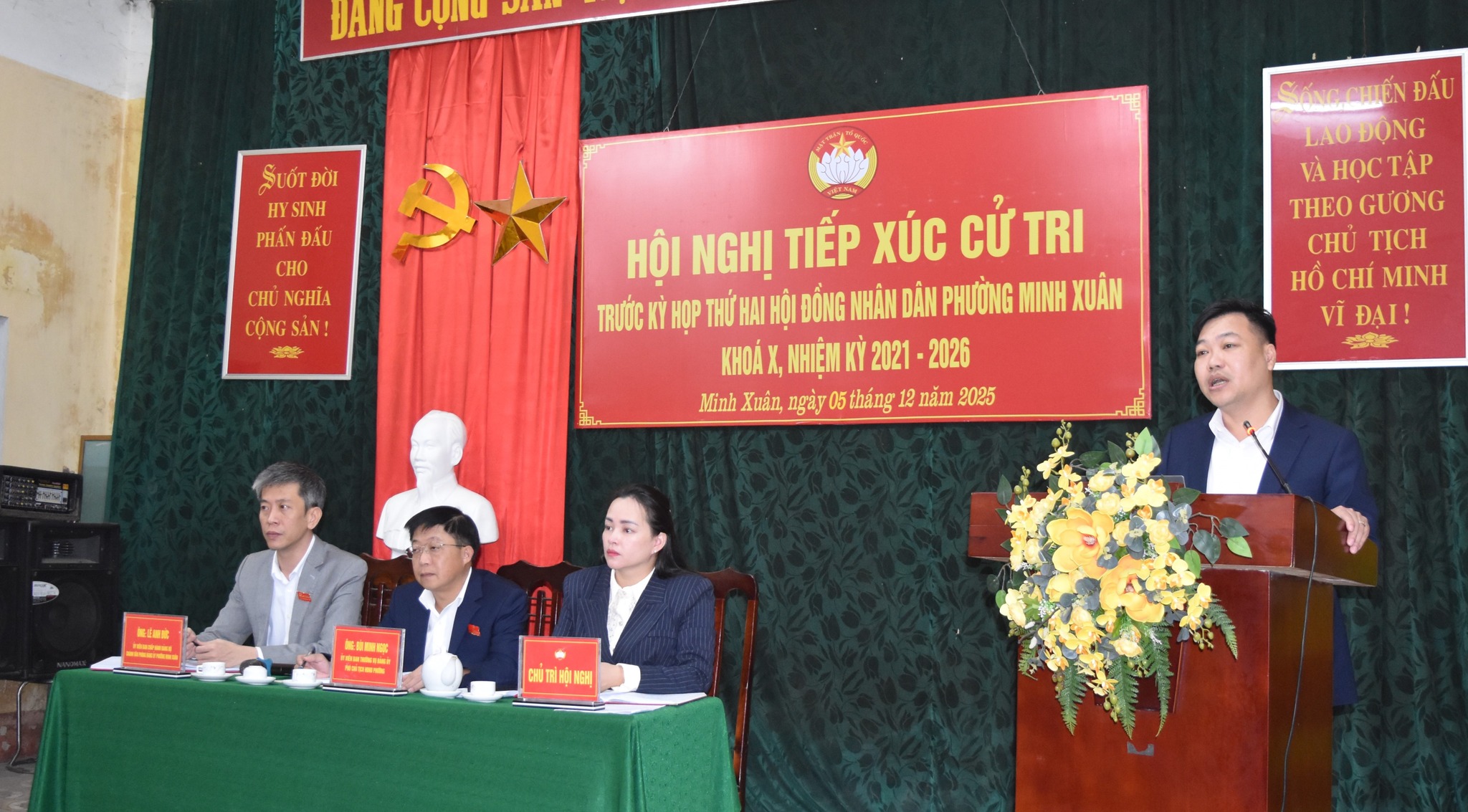 Tại Hội nghị, đại diện cử tri các tổ dân phố Tân Quang và tổ dân phố Minh Xuân, phường Minh Xuân được nghe thông báo dự kiến chương trình kỳ họp thứ hai, HĐND phường; Báo cáo tóm tắt về tình hình và kết quả thực hiện nhiệm vụ phát triển kinh tế - xã hội, an ninh - quốc phòng năm 2025; nhiệm vụ phát triển kinh tế - xã hội năm 2026 phường Minh Xuân…