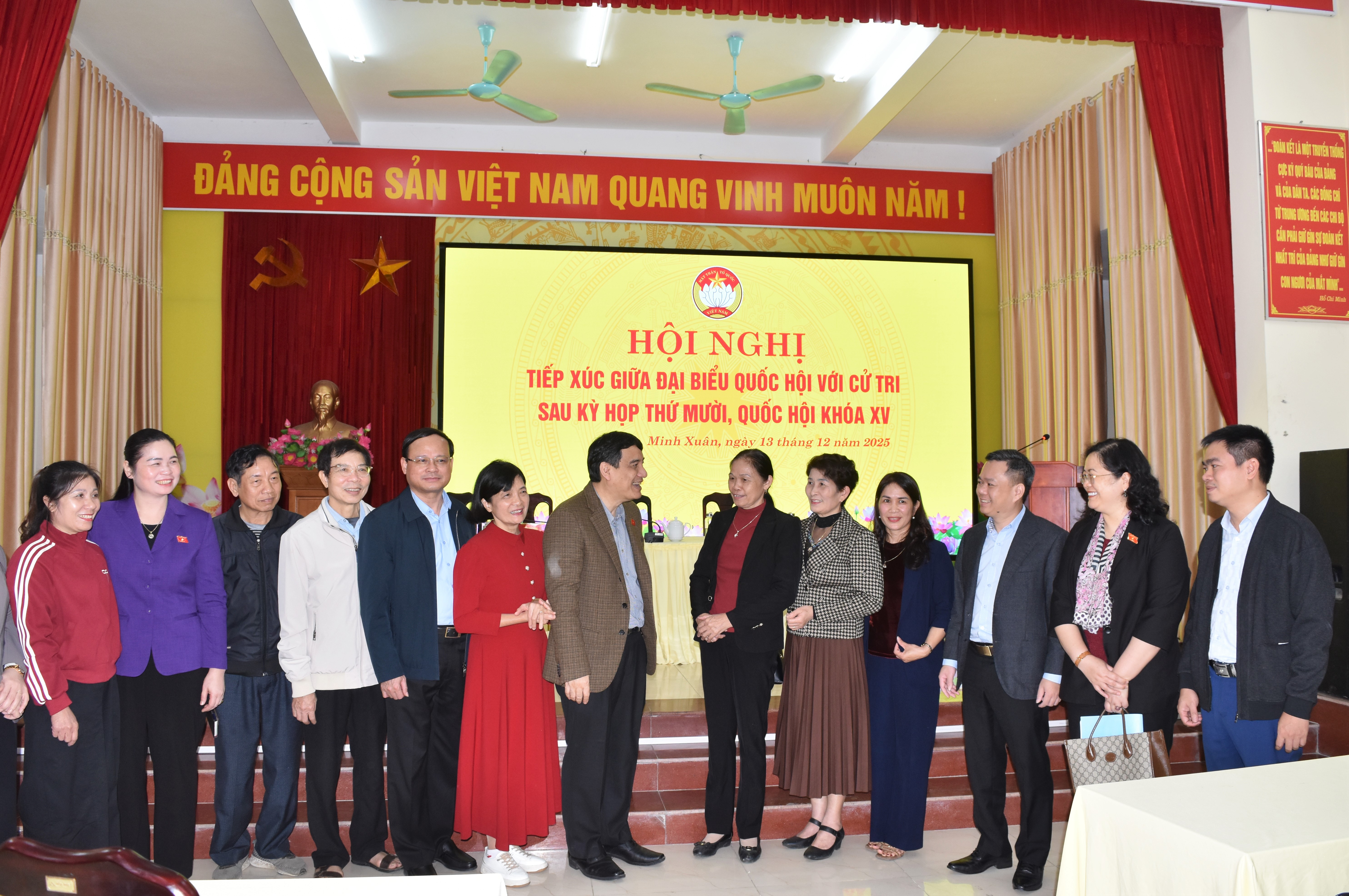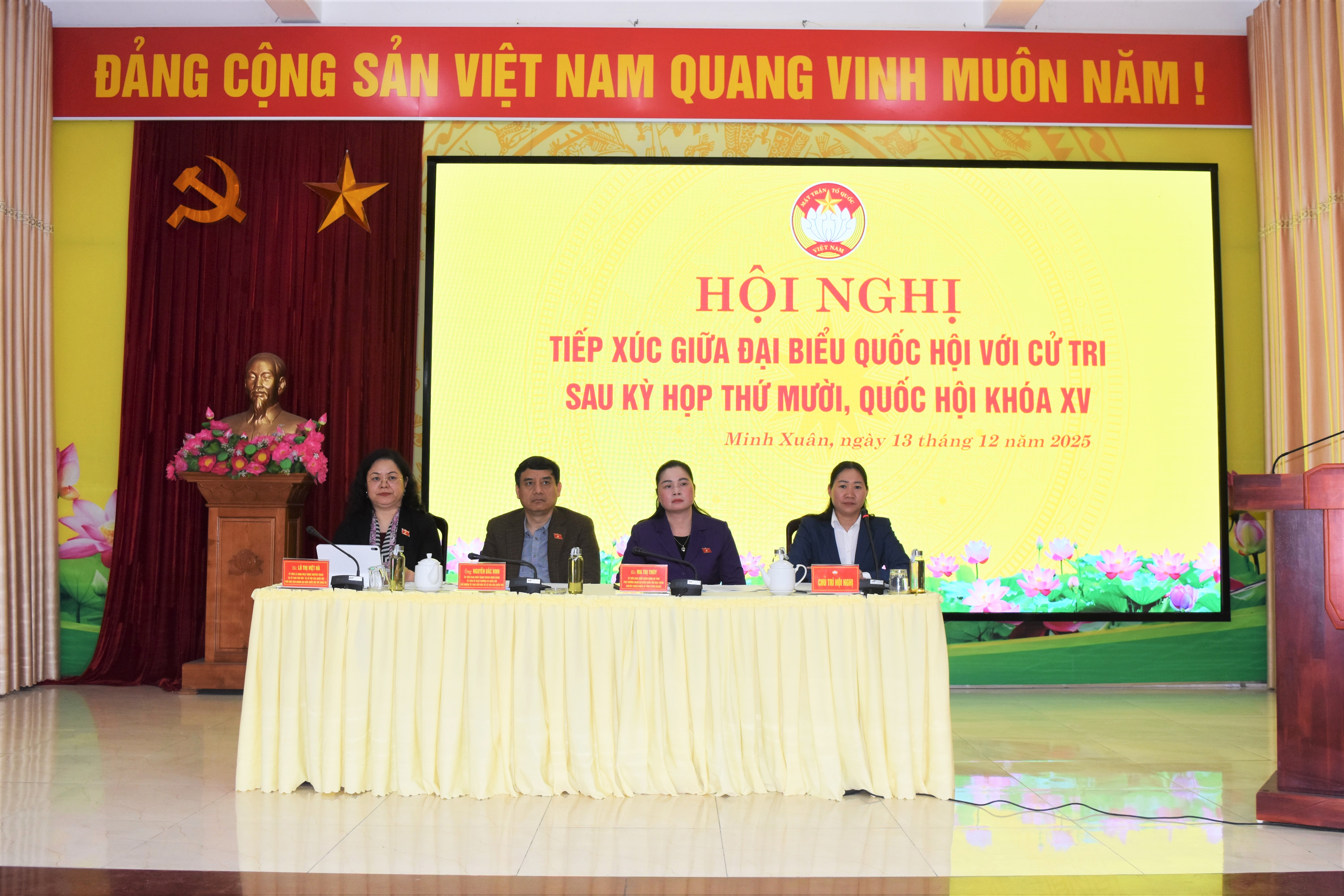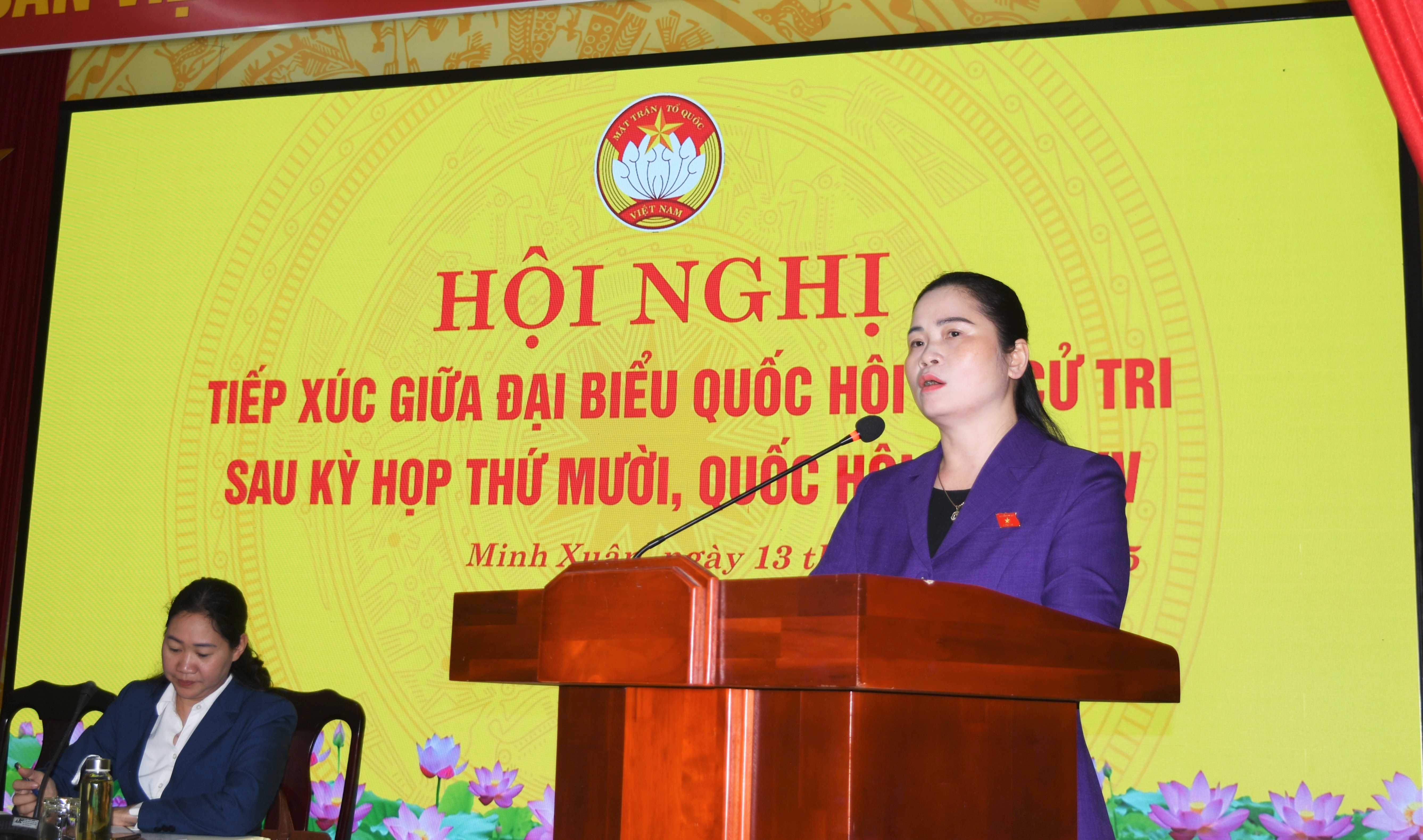 Tại Hội nghị, đồng chí Phó Trưởng đoàn chuyên trách Đoàn ĐBQH tỉnh Ma Thị Thúy đã thông báo tới cử tri về kết quả Kỳ họp thứ 10, Quốc hội khóa XV. Sau 40 ngày làm việc, Kỳ họp thứ 10, Quốc hội khóa XV đã thành công tốt đẹp, hoàn thành toàn bộ nội dung, chương trình đề ra. Quốc hội đã xem xét, thông qua 51 luật, 39 nghị quyết; tiến hành tổng kết công tác nhiệm kỳ 2021 - 2026 của các cơ quan trong bộ máy nhà nước; xem xét, quyết định công tác nhân sự thuộc thẩm quyền; giám sát chuyên đề, thảo luận, góp ý kiến về dự thảo Văn kiện trình Đại hội đại biểu toàn quốc lần thứ XIV của Đảng; xem xét, quyết định các vấn đề về kinh tế - xã hội, ngân sách nhà nước, chủ trương đầu tư các chương trình mục tiêu quốc gia, các dự án quan trọng quốc gia…