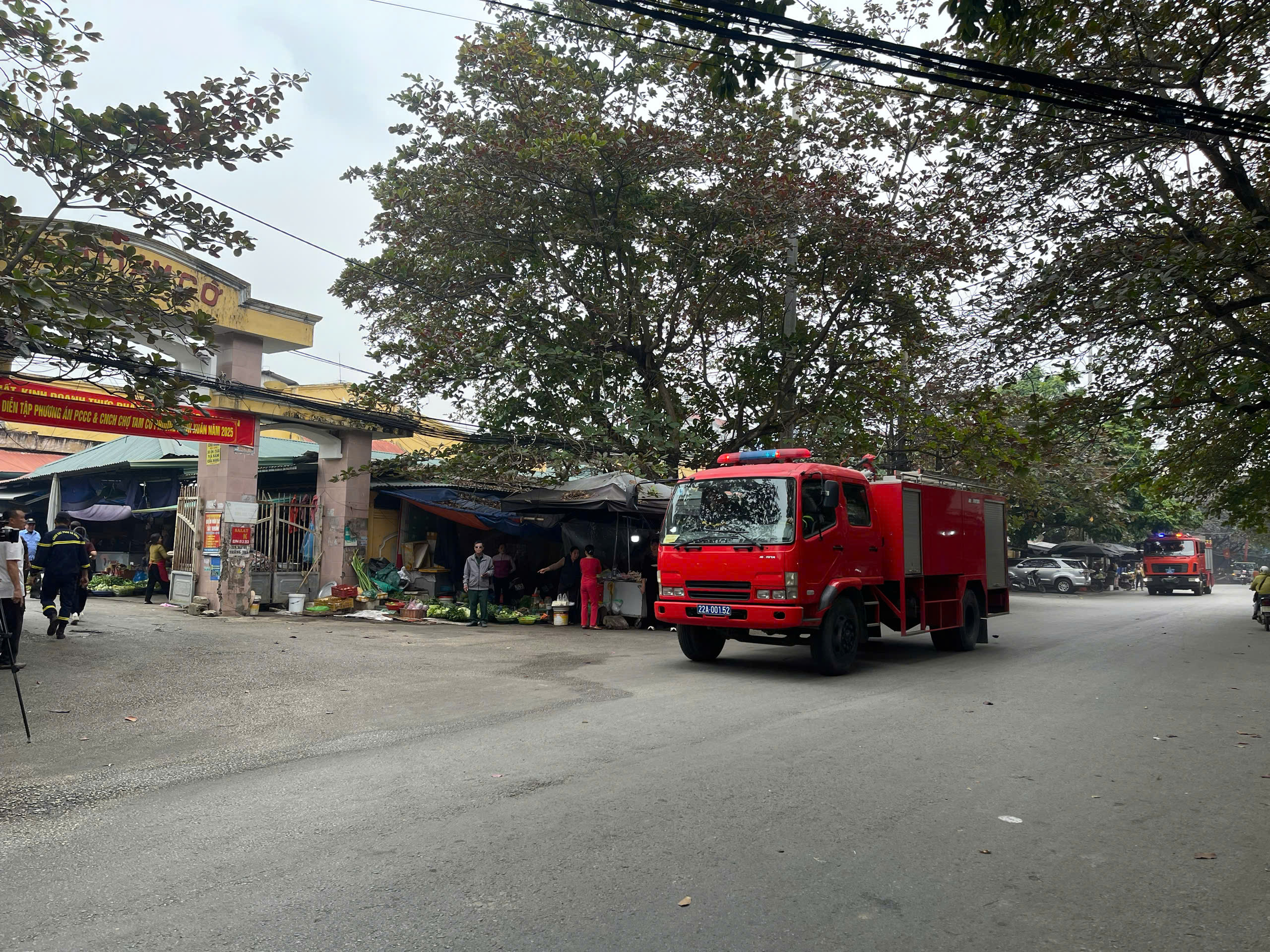 Tình huống giả định là: Khoảng 09 giờ 00 phút cùng ngày, xảy ra cháy tại khu vực kinh doanh hàng mã, hàng nón, mũ, túi xác, đồ dùng cá nhân trong nhà đình. Nguyên nhân là do sự cố chập hệ thống điện. Cháy xảy ra trong giờ làm việc, lực lượng tại chỗ phát hiện kịp thời nhưng do lượng hàng hóa tồn chứa lớn, là các chất dễ cháy nên đám cháy phát triển mạnh, sinh ra nhiều khói, khí độc, đe dọa đến tính mạng của những người có mặt trong chợ. Lực lượng phòng cháy chữa cháy cơ sở đã nhanh chóng báo động, tổ chức chữa cháy ban đầu, sử dụng các phương tiện, thiết bị PCCC tại chỗ để khống chế đám cháy, đồng thời triển khai các biện pháp cứu nạn, cứu hộ theo phương án đã được xây dựng, đồng thời điện báo lực lượng Cảnh sát PCCC và CNCH của Công an tỉnh.