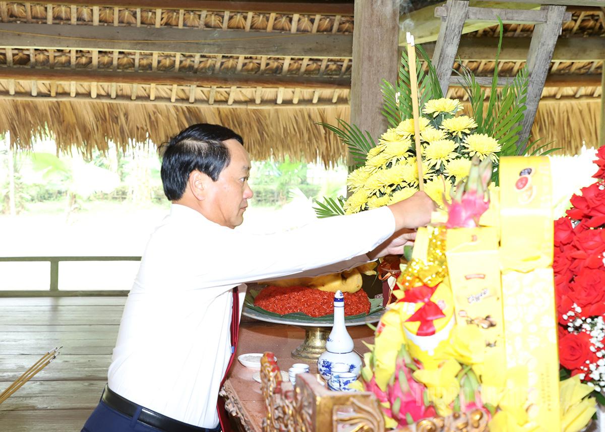 Đồng chí Bí thư Tỉnh ủy Hầu A Lềnh dâng hương Chủ tịch Hồ Chí Minh tại lán Nà Nưa. Ảnh: Thanh Phúc