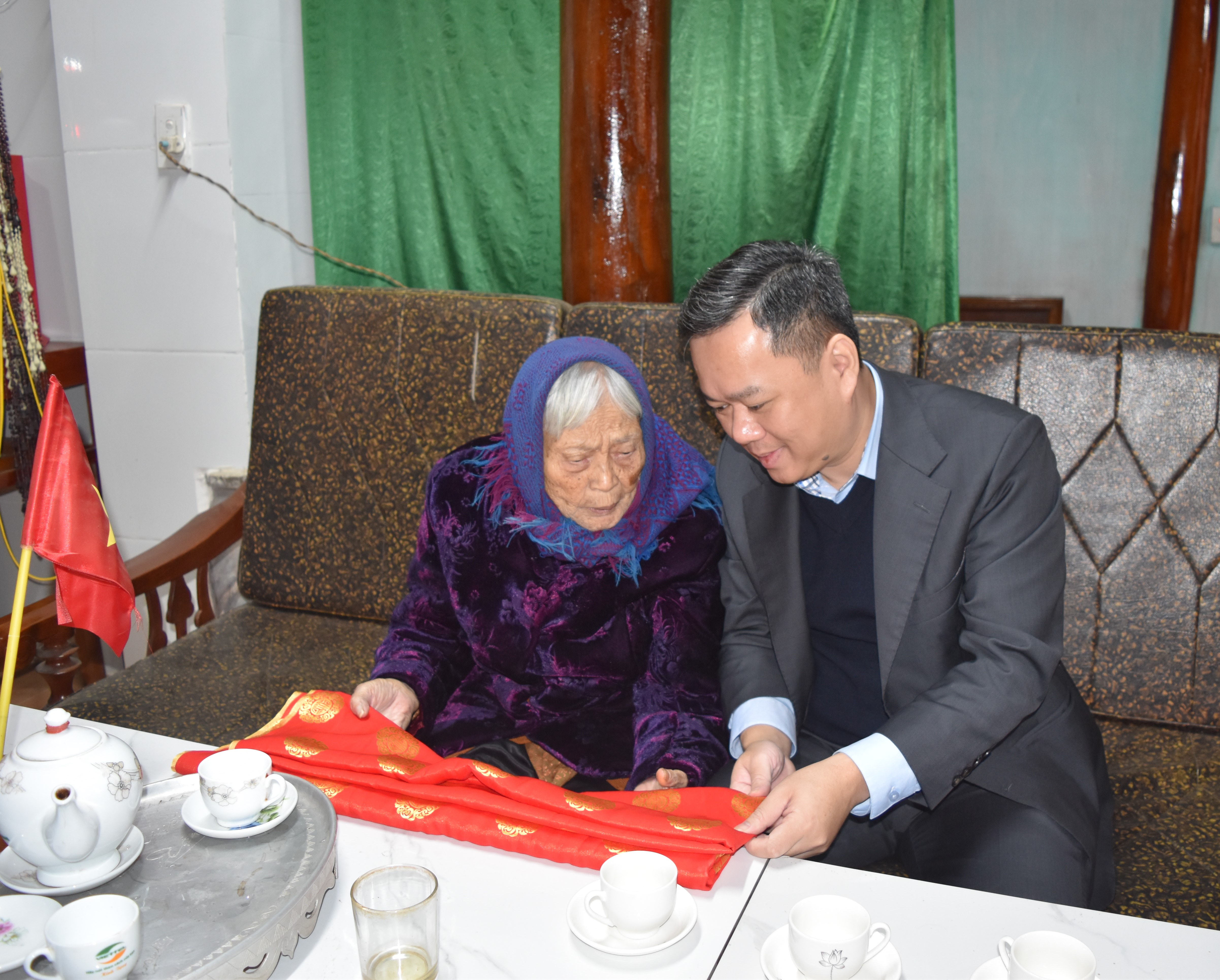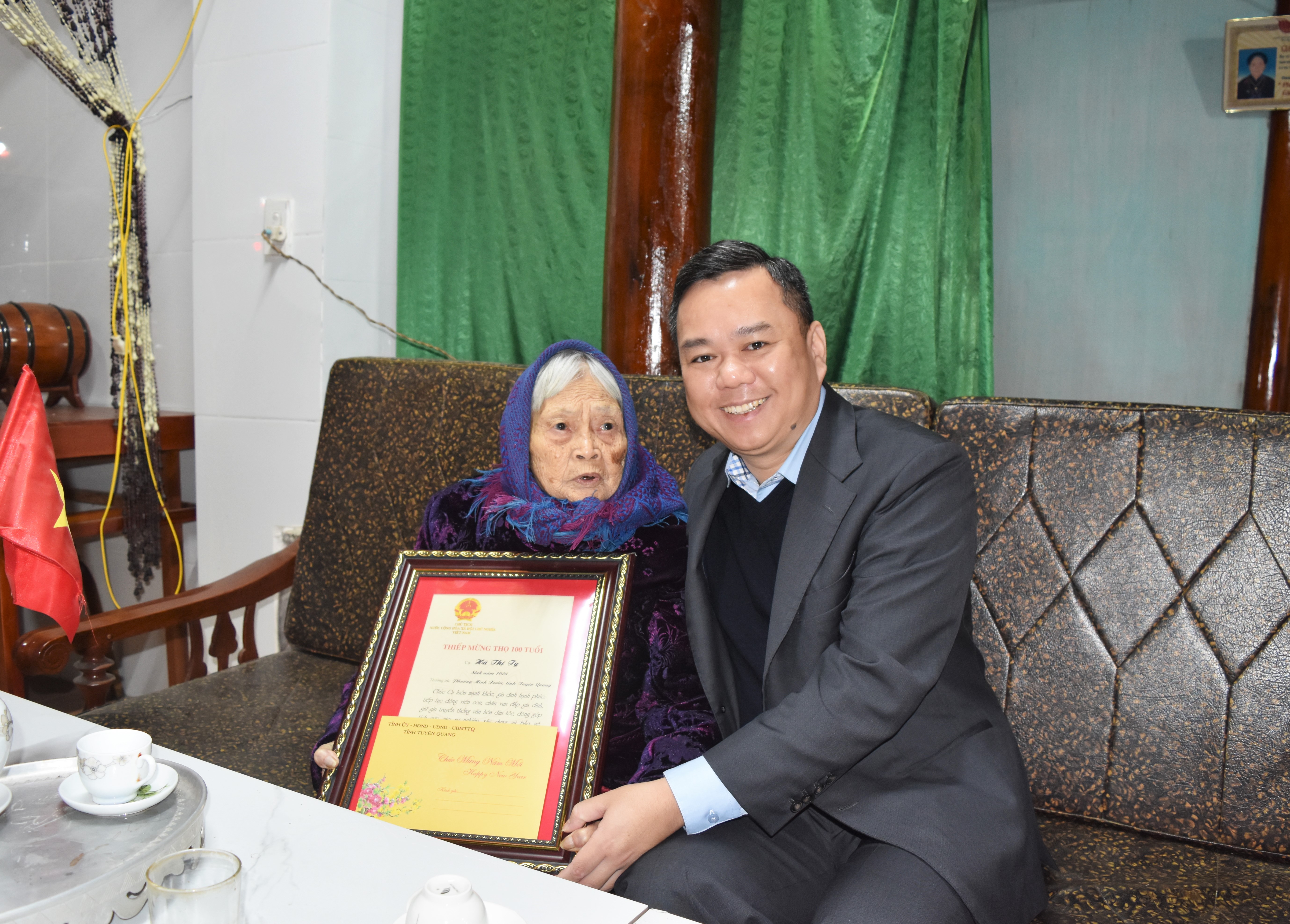 Tại các gia đình, đồng chí trân trọng trao thiệp chúc thọ và lụa của Chủ tịch nước, ân cần thăm hỏi sức khỏe, đời sống sinh hoạt của các cụ; bày tỏ sự quan tâm sâu sắc của Đảng, Nhà nước và chính quyền địa phương đối với người cao tuổi, đặc biệt là các cụ cao niên tròn 100 tuổi.