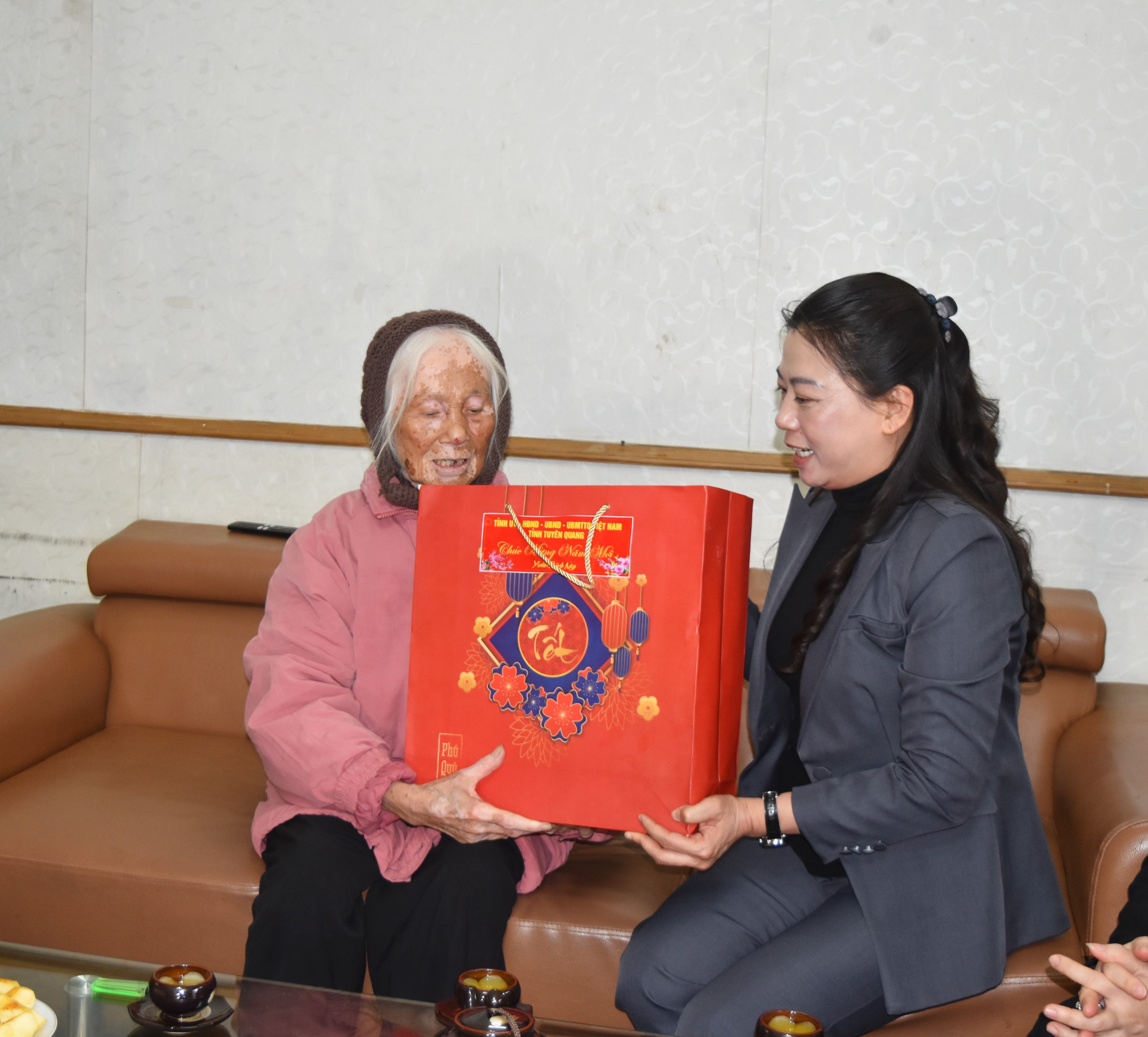 Đồng chí Phó Bí thư Thường trực Đảng ủy phường Minh Xuân Đinh Thị Thu Hà - Chúc Tết gia đình đồng chí Ngụy Văn Thận, Nguyên Phó Bí thư Thường trực Tỉnh ủy