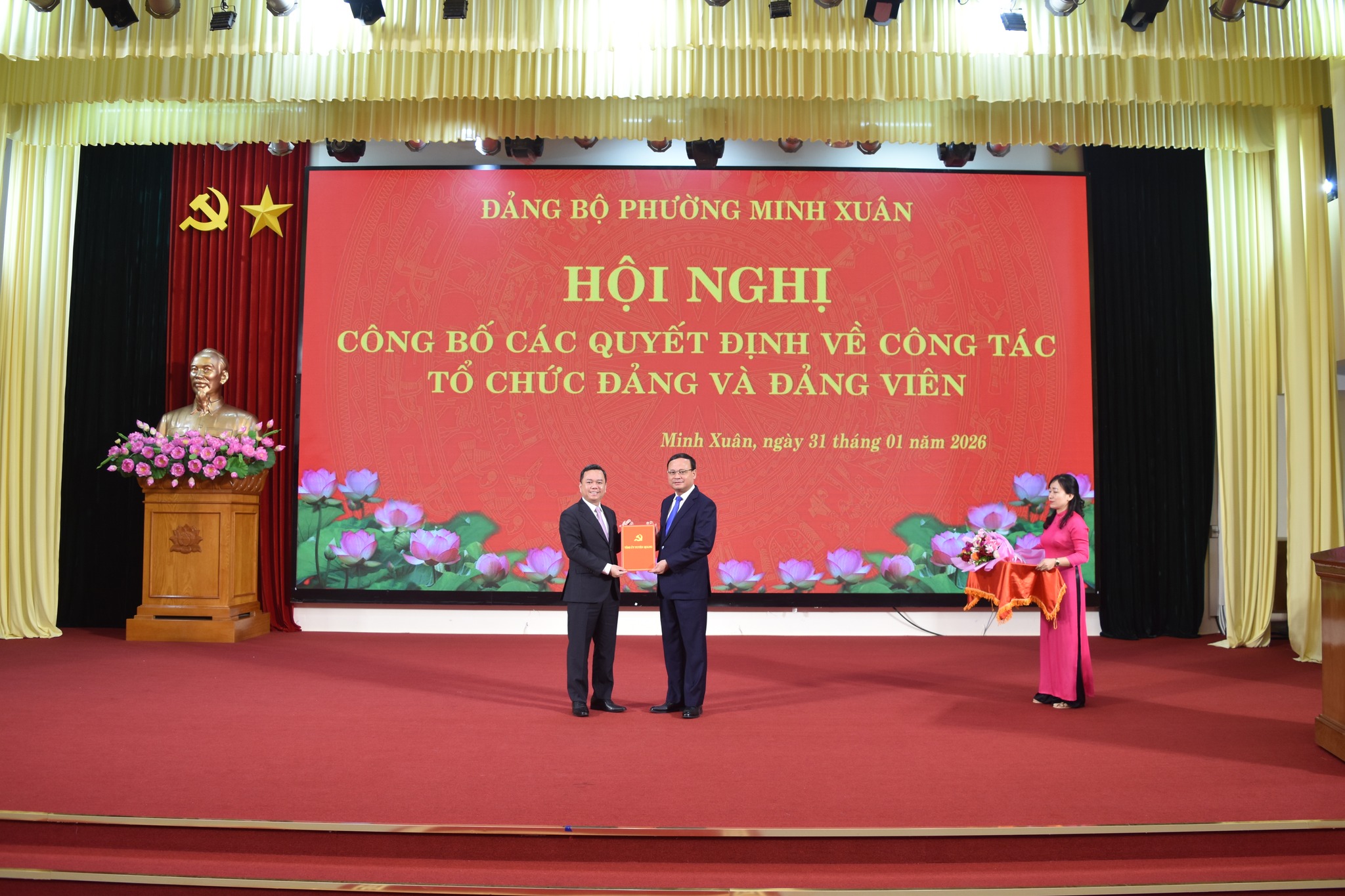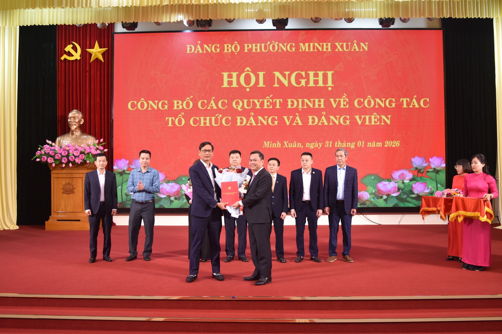 Đồng chí Nguyễn Mạnh Tuấn, Ủy viên Ban Thường vụ Tỉnh ủy, Phó Chủ tịch Thường trực UBND tỉnh trao các quyết định của Tỉnh ủy cho Đảng ủy phường Minh Xuân.