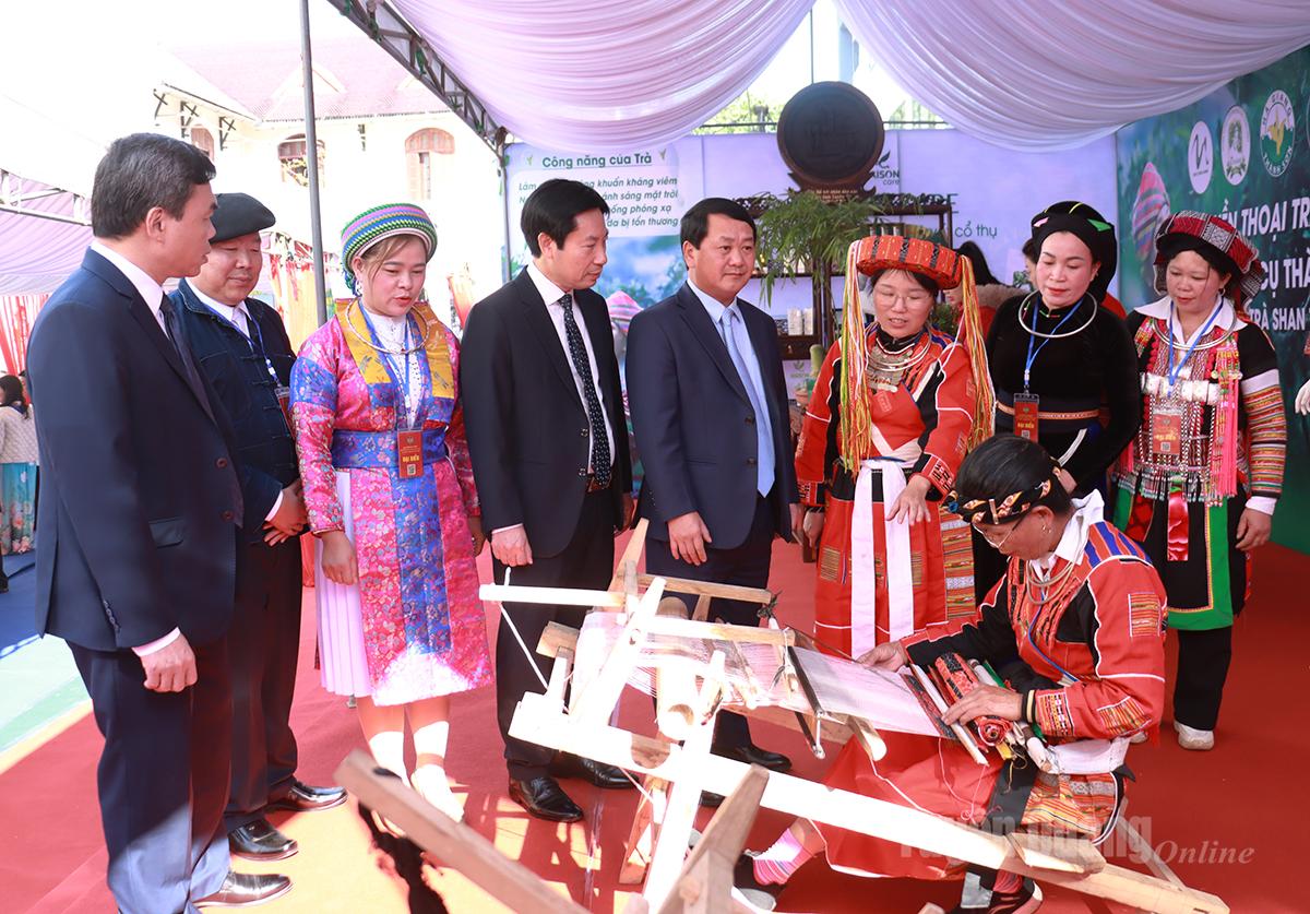 Bí thư Tỉnh ủy Hầu A Lềnh cùng các đại biểu tham quan gian trưng bày nghề dệt lanh truyền thống tại Đại hội.