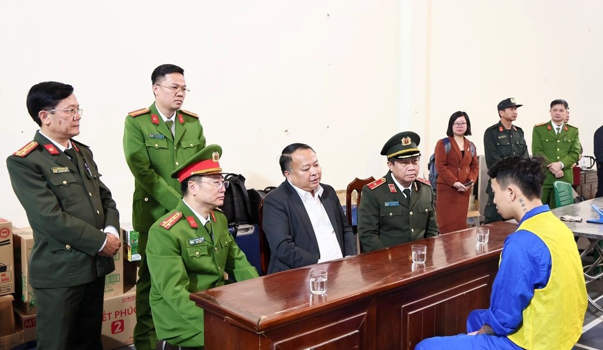Đồng chí Thiếu tướng Nguyễn Đức Thuận, Giám đốc Công an tỉnh; đồng chí Đại tá Ma Quang Trung, Thủ trưởng Cơ quan CSĐT, Phó Giám đốc Công an tỉnh và lãnh đạo Phòng Cảnh sát hình sự làm việc với đối tượng trong đường dây lừa đảo tại Campuchia.