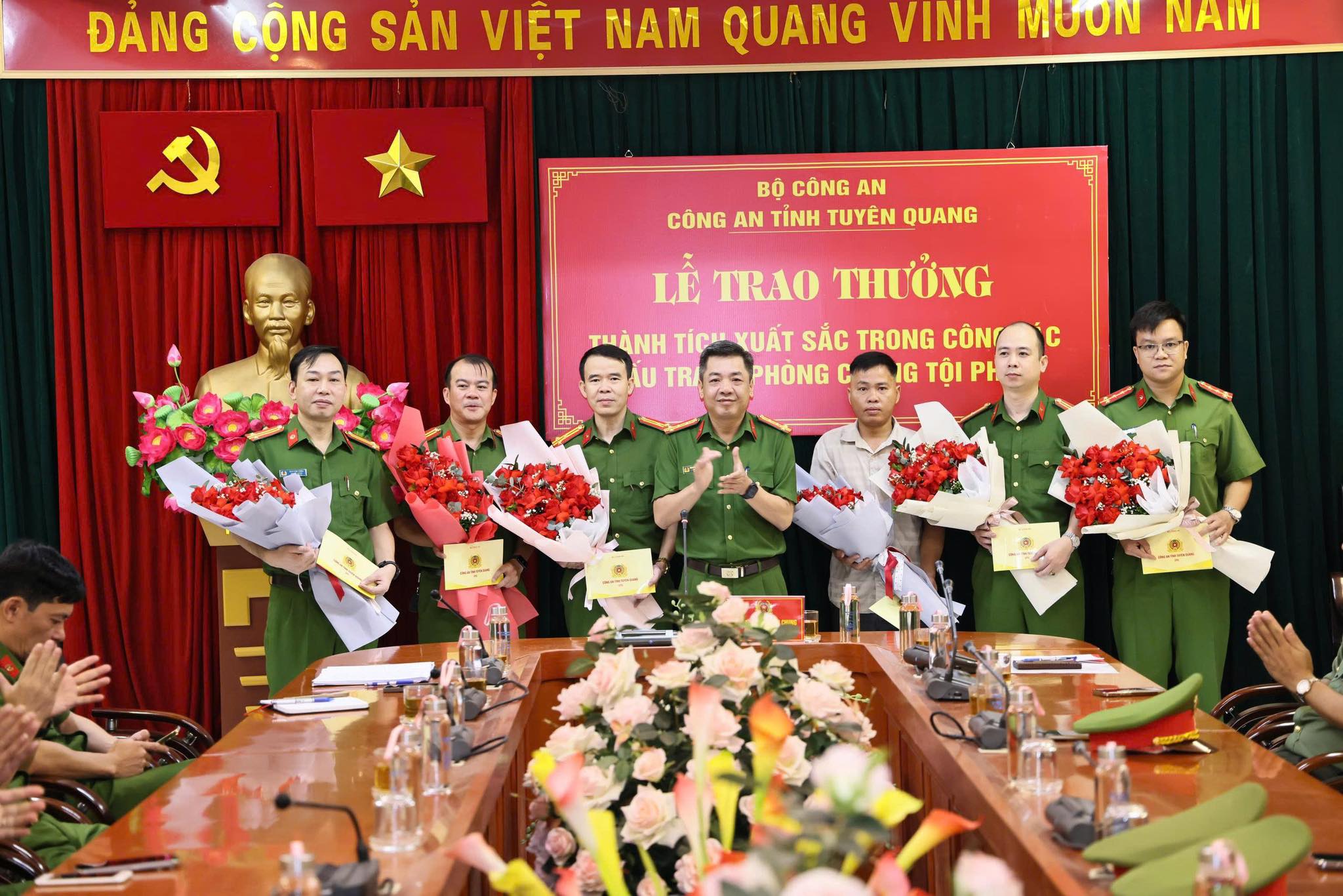 Chủ tịch UBND tỉnh Tuyên Quang Phan Huy Ngọc tặng hoa, trao thưởng các lực lượng đấu tranh phá thành công chuyên án đường dây lừa đảo tại Campuchia.