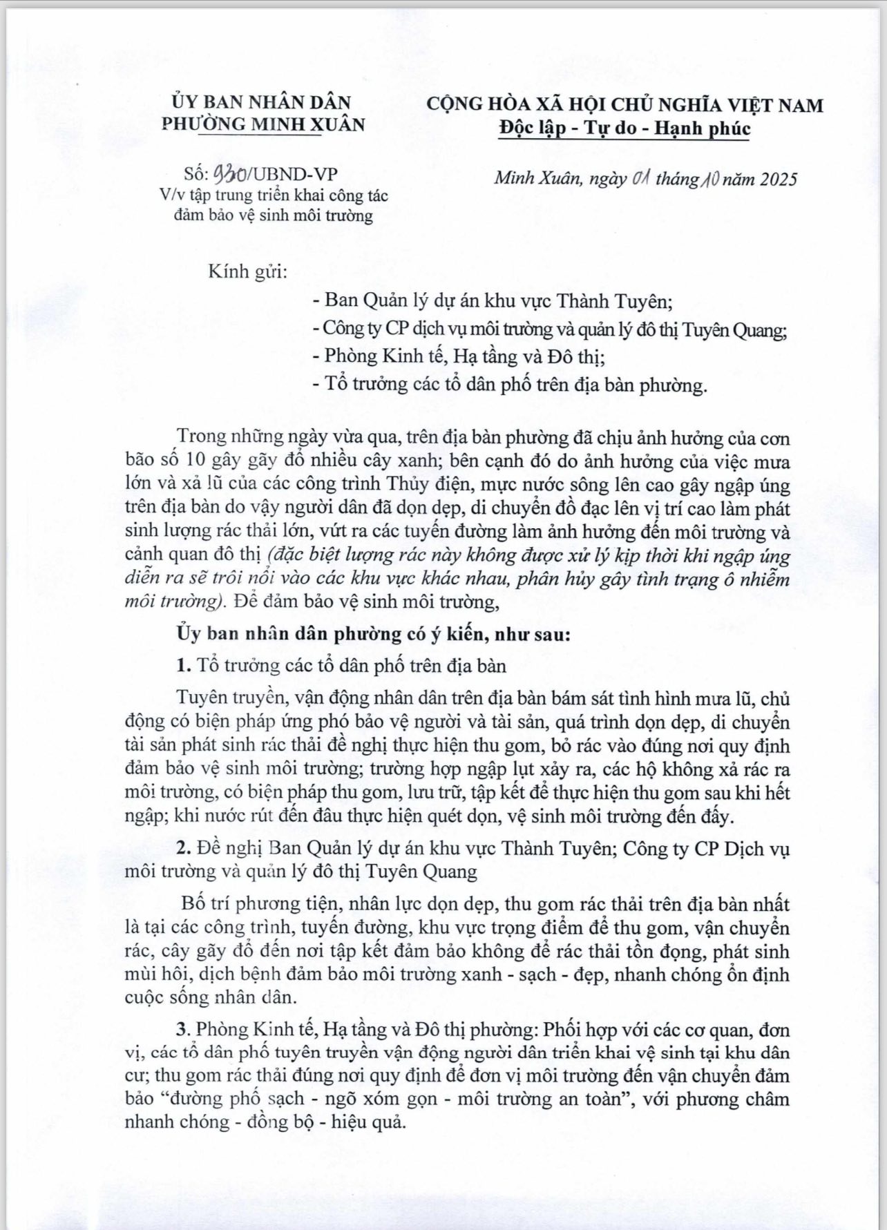 Ngày 1 tháng 10 năm 2025, Ủy ban nhân dân phường Minh Xuân đã ban hành văn bản Số: 930/UBND-VP V/v tập trung triển khai công tác đảm bảo vệ sinh môi trường