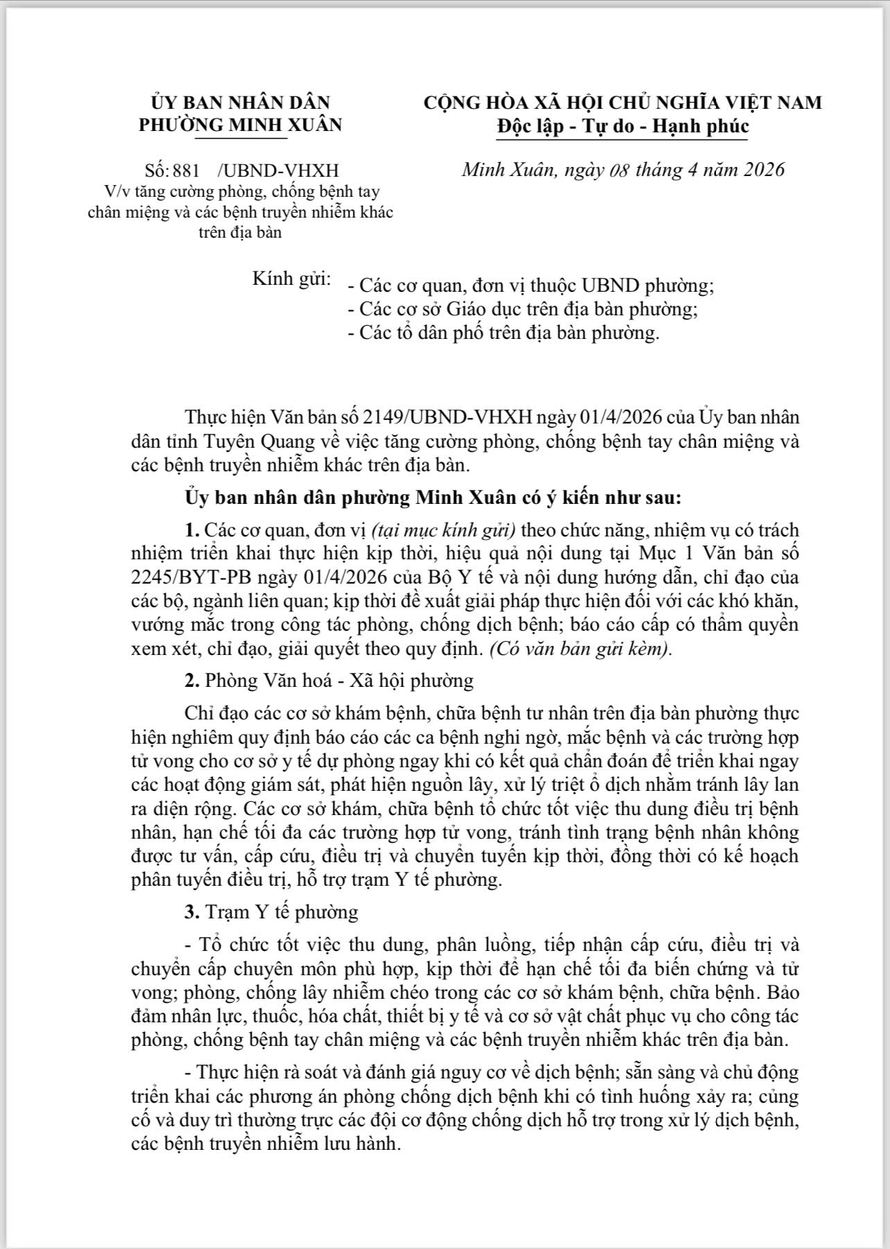 Ngày 8/4/2026, UBND phường Minh Xuân đã ban hành Công văn số 881 về việc tăng cường phòng, chống bệnh tay chân miệng và các bệnh truyền nhiễm khác trên địa bàn phường.