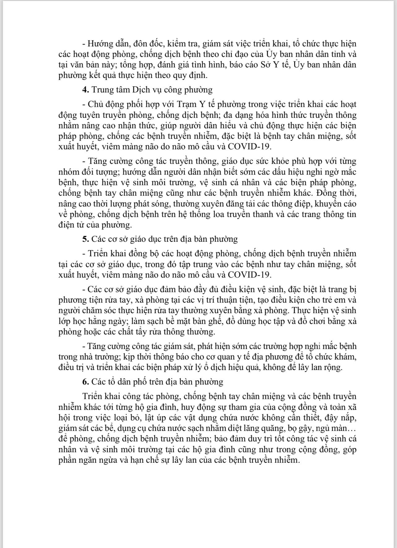 Để chủ động triển khai các biện pháp phòng, chống bệnh tay chân miệng và một số bệnh truyền nhiễm khác trên địa bàn phường, hạn chế tối đa số ca mắc và tử vong, UBND phường Minh Xuân yêu cầu các Phòng ban, cơ quan đơn vị theo chức năng nhiệm vụ, triển khai đồng bộ, quyết liệt các biện pháp phòng, chống dịch bệnh, nhất là trong bối cảnh một số bệnh truyền nhiễm có nguy cơ gia tăng như sốt xuất huyết, viêm màng não do não mô cầu, COVID-19.