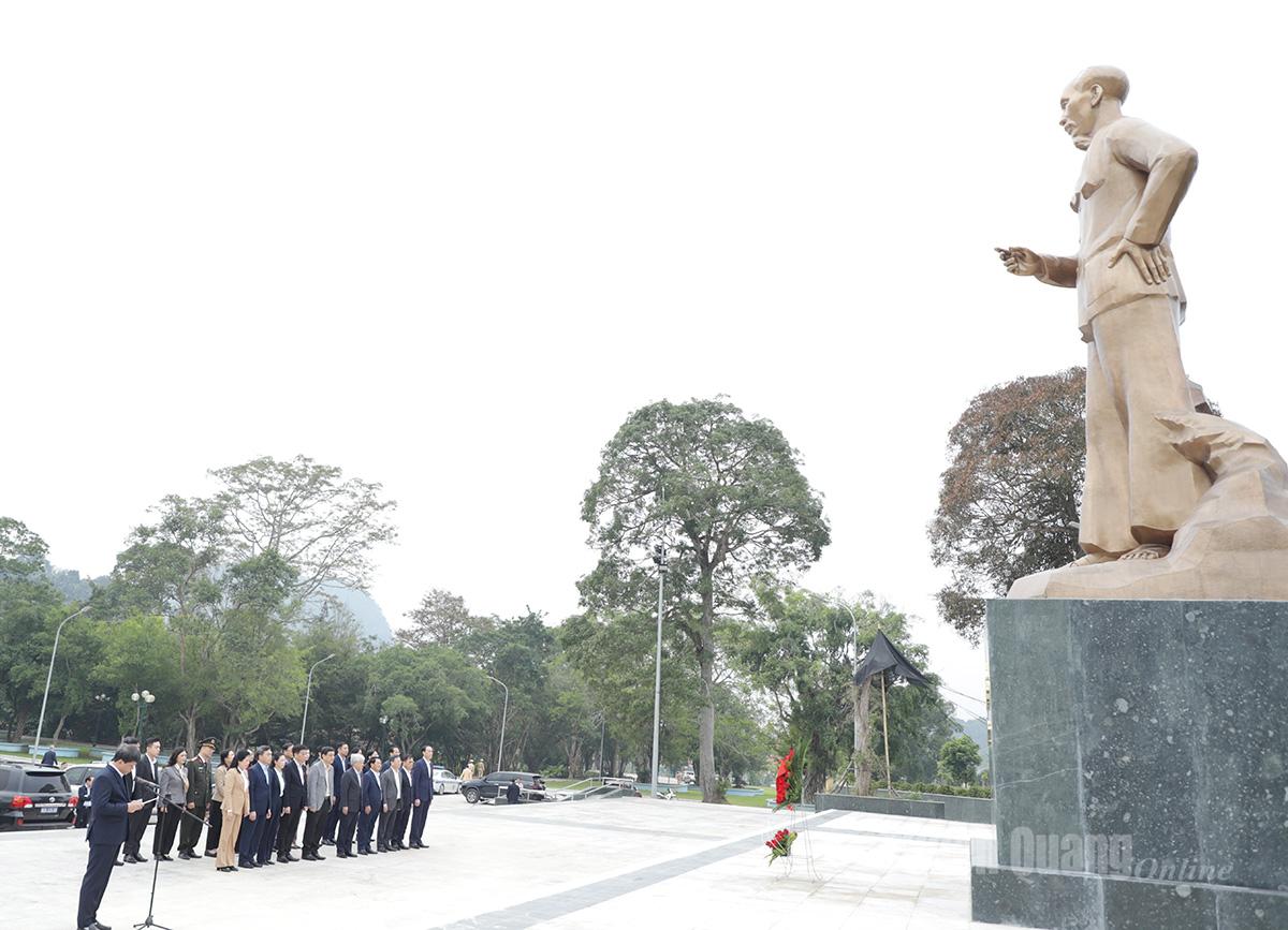 Đoàn công tác thực hiện nghi lễ dâng hoa trước Tượng đài Bác Hồ ở Tân Trào.