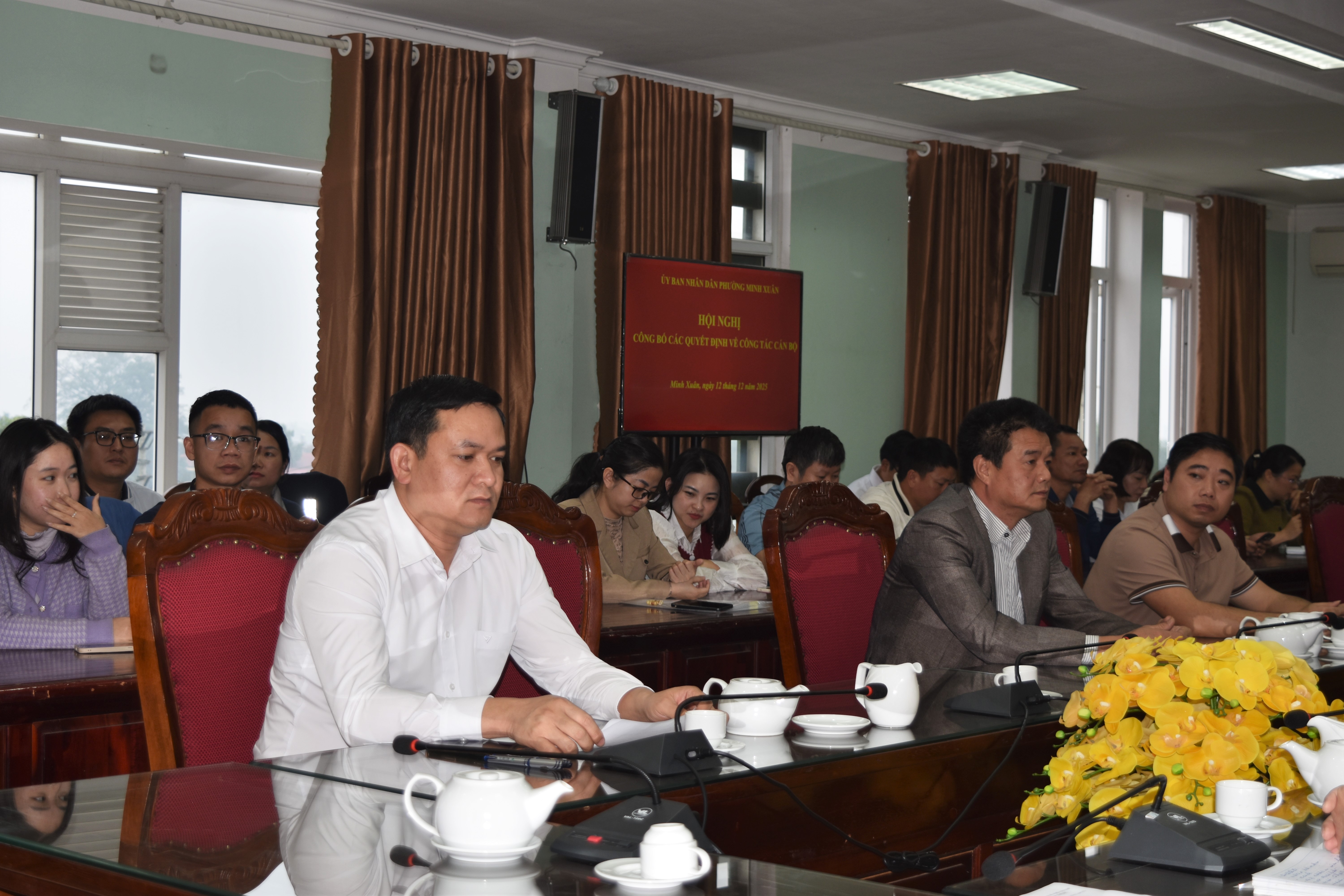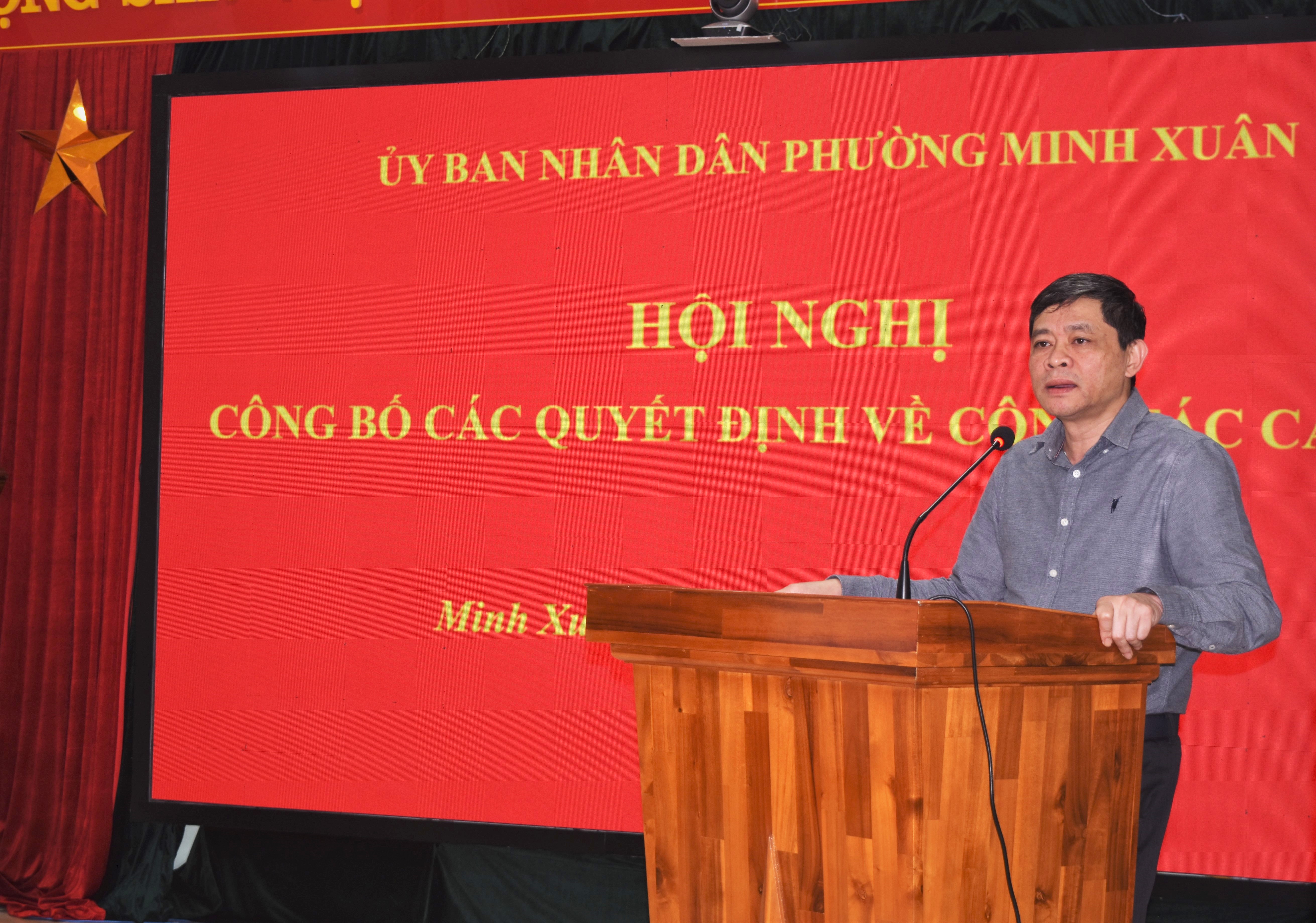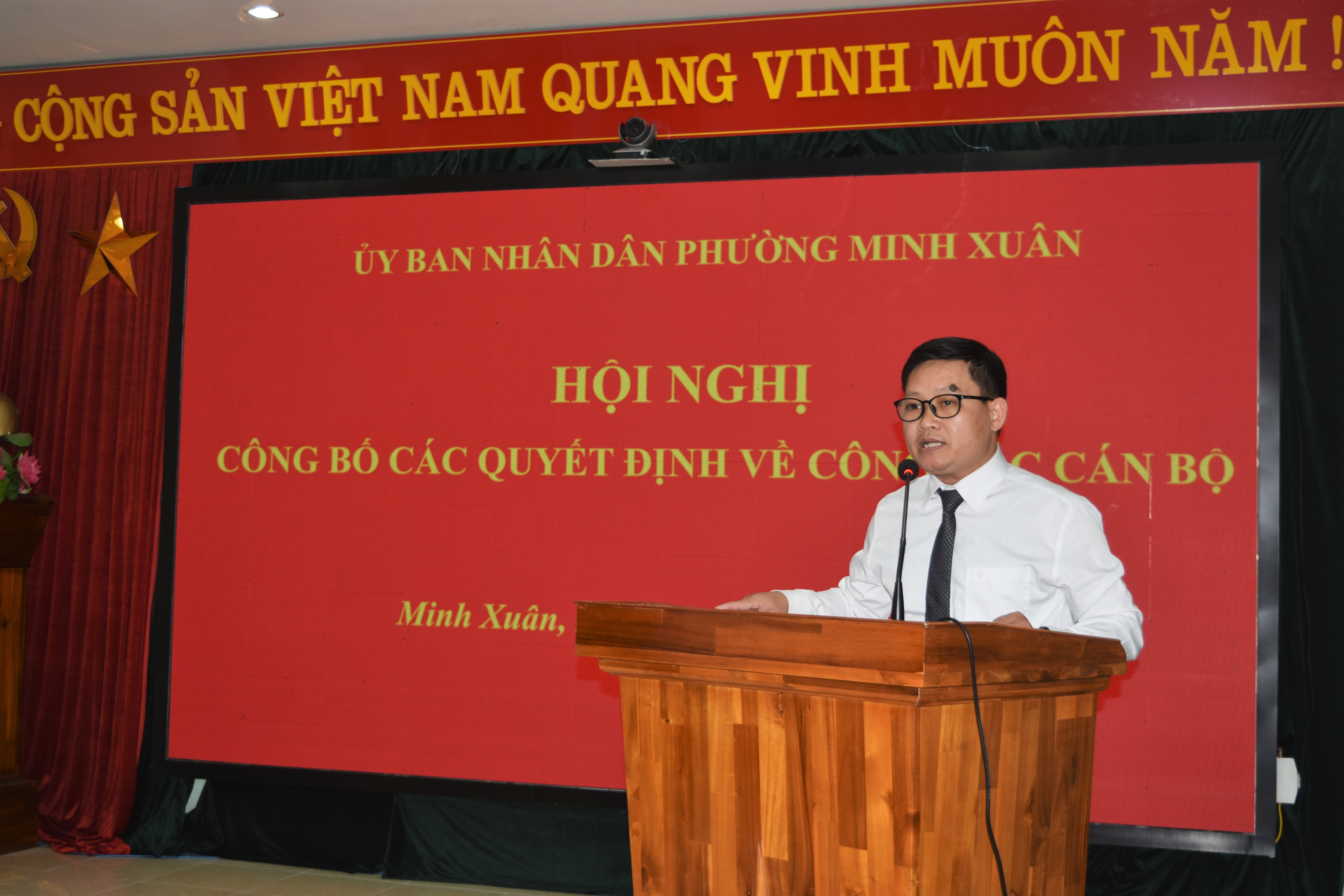 Tại Hội nghị, đồng chí Trưởng Phòng Văn hóa – Xã hội phường Ngô Tuấn Anh đã công bố Quyết định của Chủ tịch UBND phường về việc giao Quyền Giám đốc Trung tâm Dịch vụ công phường Minh Xuân đối với ông Vũ Văn Thư, Phó Giám đốc Trung tâm Dịch vụ công phường kể từ ngày 9/12/2025.