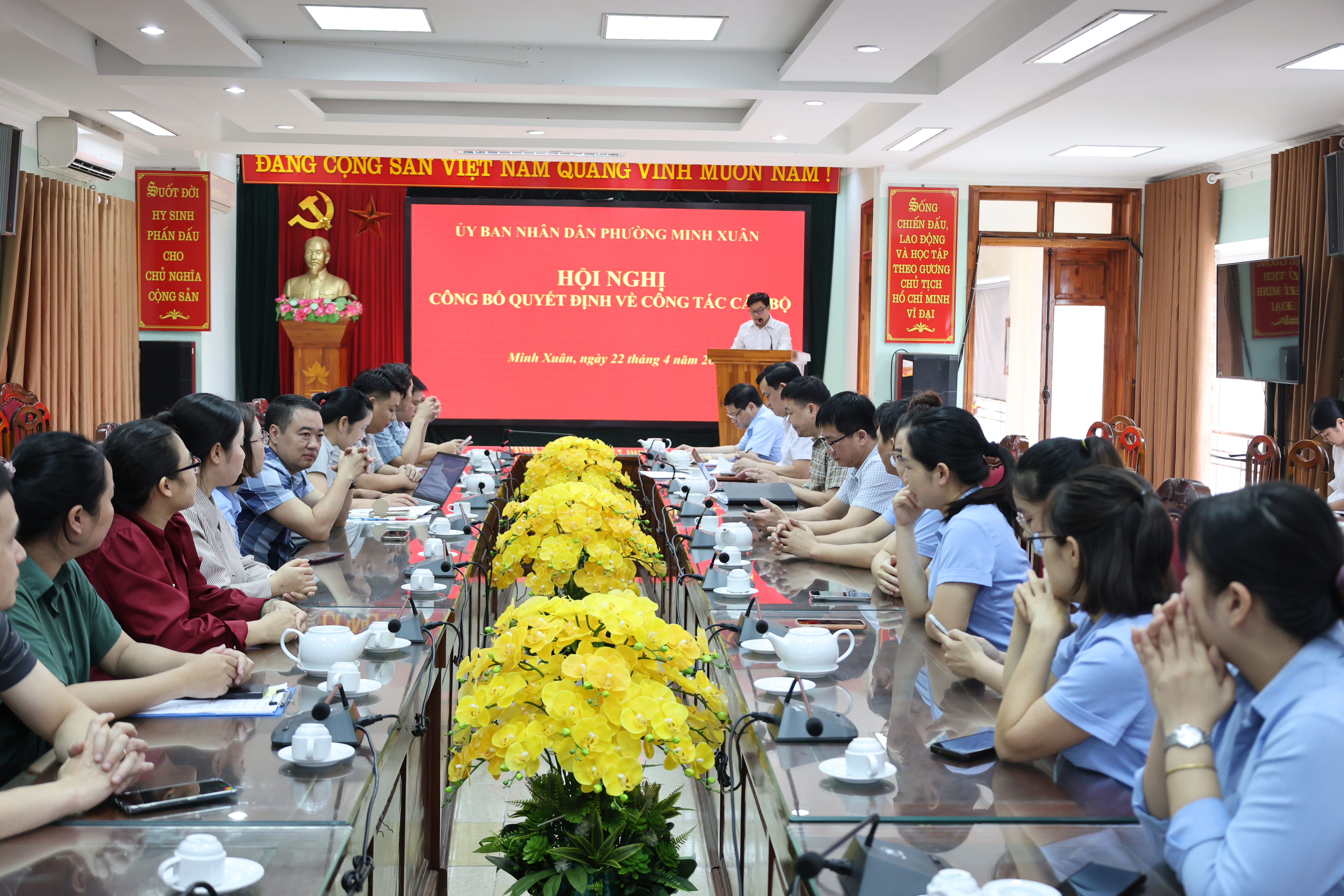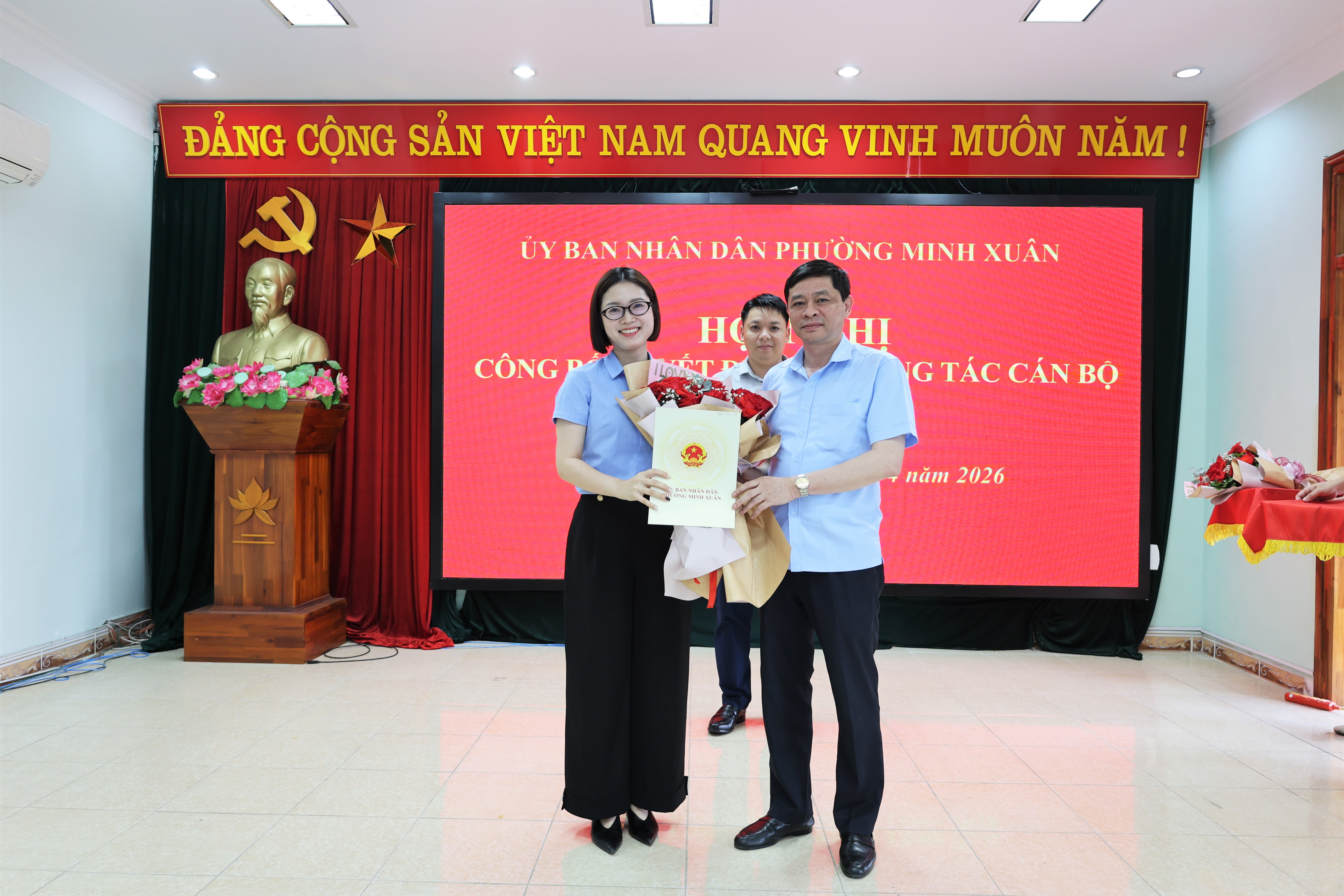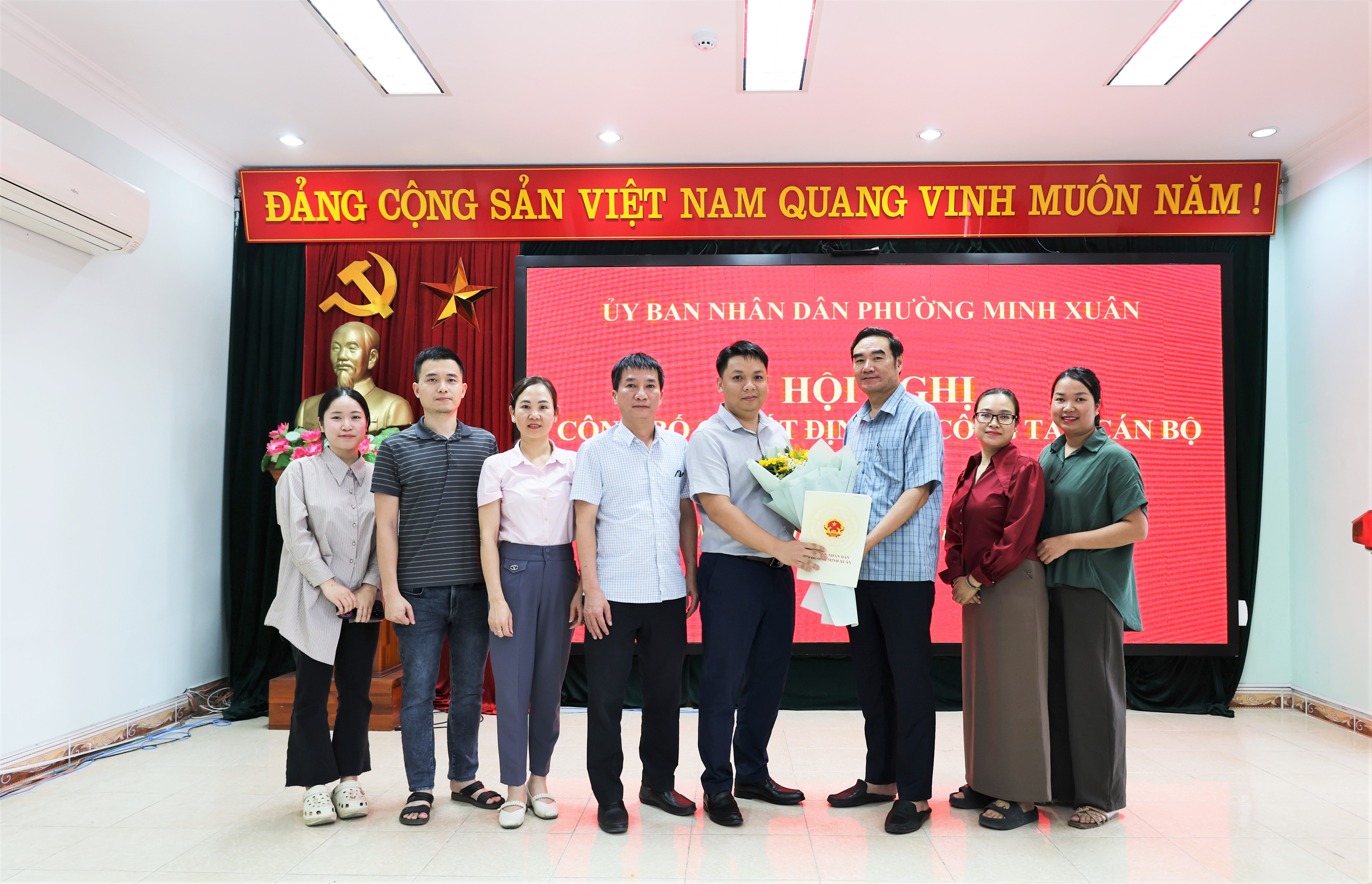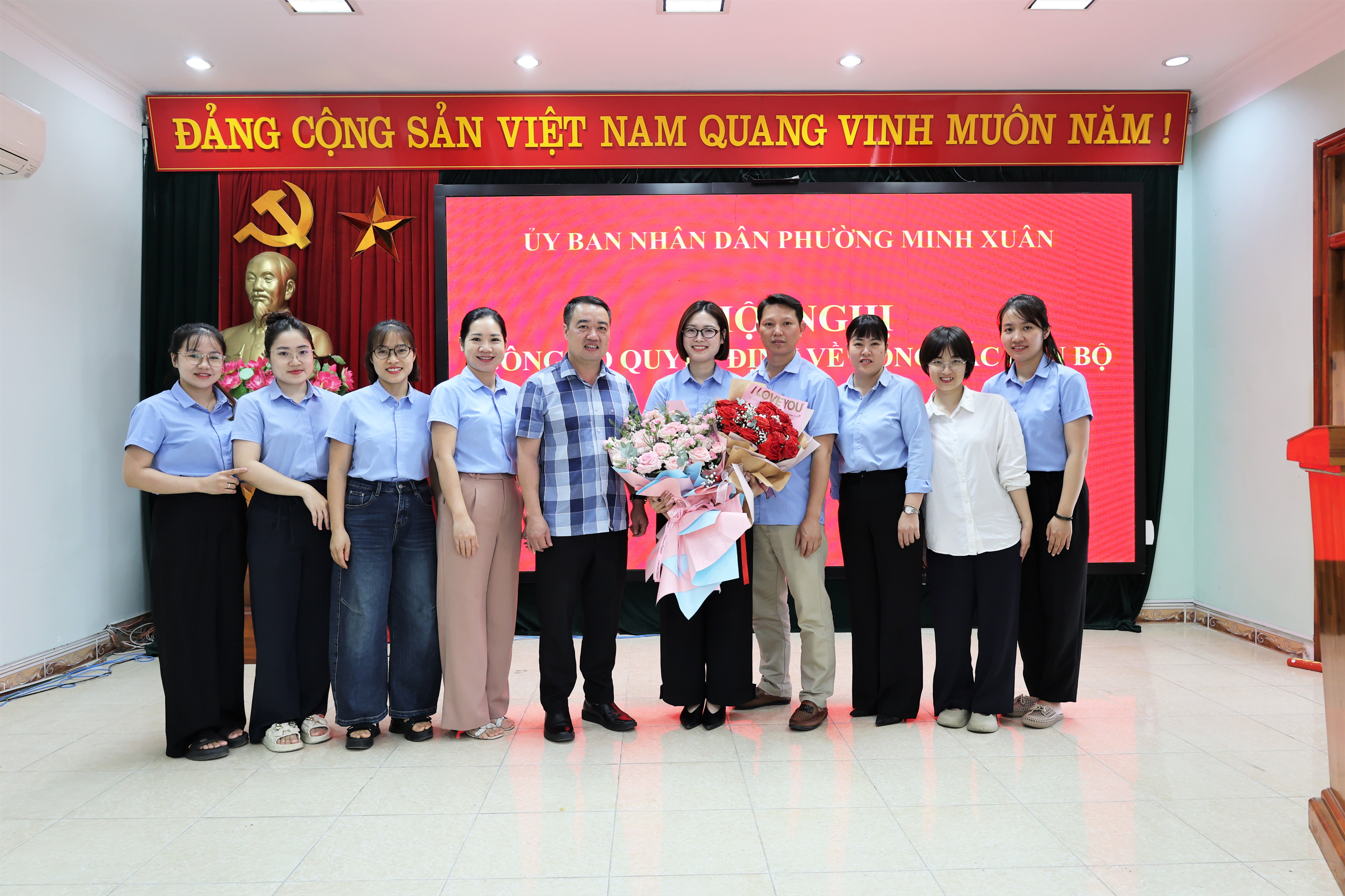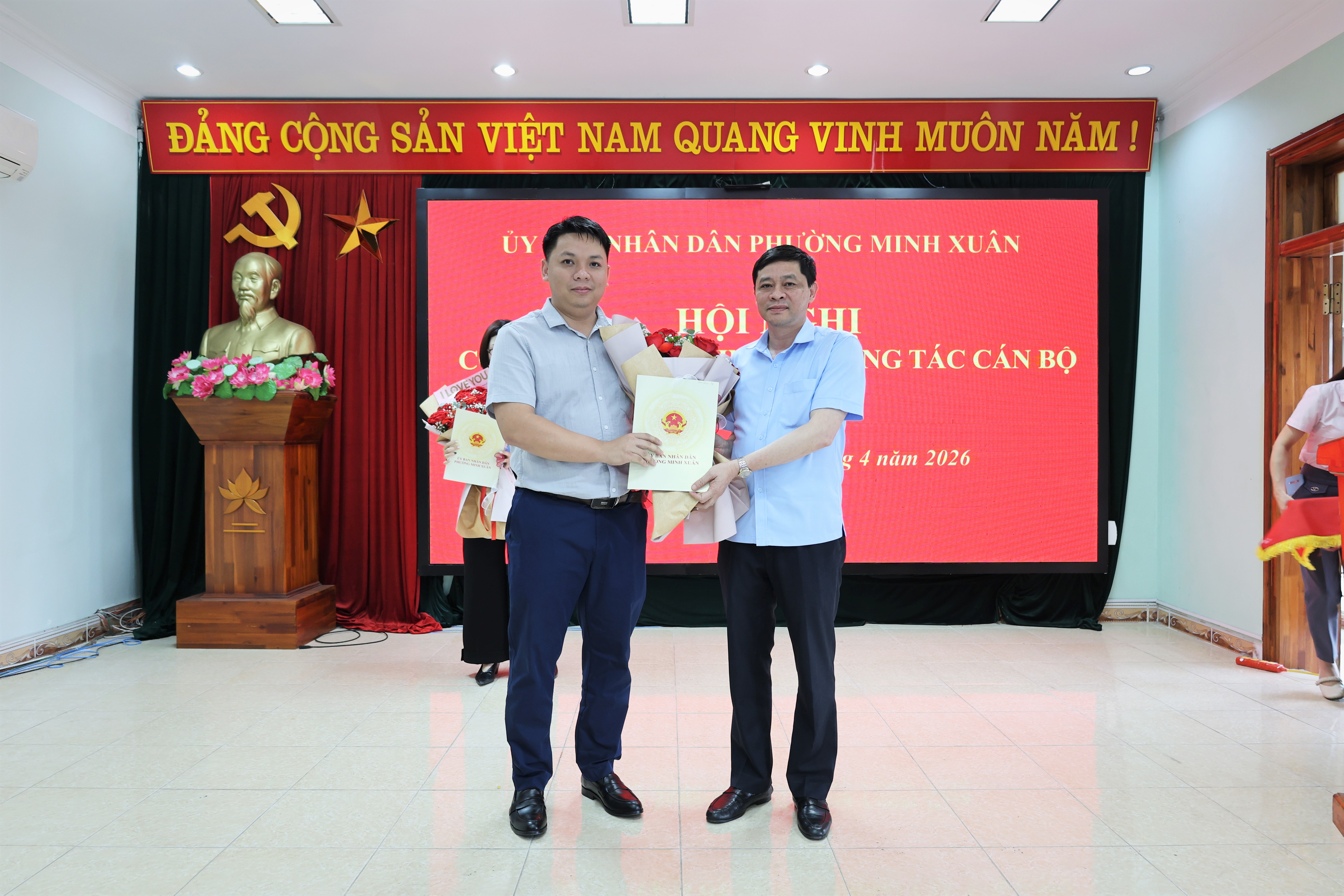 Các đồng chí lãnh đạo UBND phường Minh Xuân tặng hoa chúc mừng 2 đồng chí được Bổ nhiệm giữ chức vụ lãnh đạo quản lý