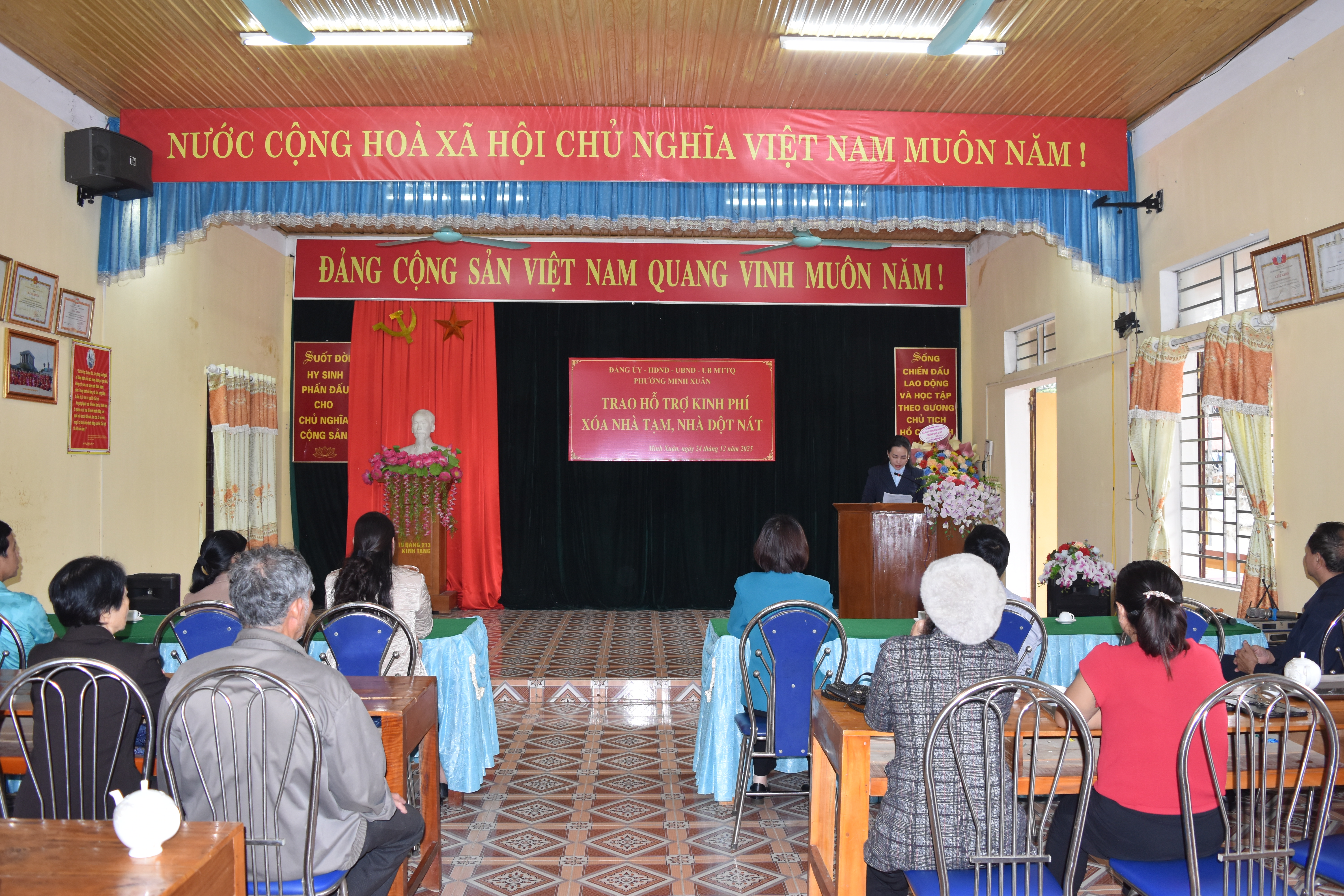 Phát biểu tại Chương trình, đồng chí Đinh Thị Thu Hà, Phó Bí thư Thường trực Đảng ủy, Chủ tịch HĐND phường nhấn mạnh ý nghĩa nhân văn sâu sắc chương trình “Xóa nhà tạm, nhà dột nát”. Chúc mừng gia đình có khó khăn về nhà ở được nhận hỗ trợ xây dựng, sửa chữa nhà. Đồng chí Phó Bí thư Thường trực Đảng ủy phường đề nghị các gia đình sử dụng hiệu quả số tiền được hỗ trợ, đồng thời phát huy nội lực, khắc phục khó khăn, cố gắng xây dựng được ngôi nhà kiên cố, vững chãi, yên tâm làm ăn phát triển kinh tế, xây dựng gia đình no ấm, hạnh phúc. MTTQ từ phường đến các tổ dân phố tiếp tục vận động đoàn viên, hội viên, nhân dân cùng quan tâm, giúp đỡ các gia đình còn khó khăn trong quá trình xây dựng nhà, vươn lên ổn định cuộc sống.
