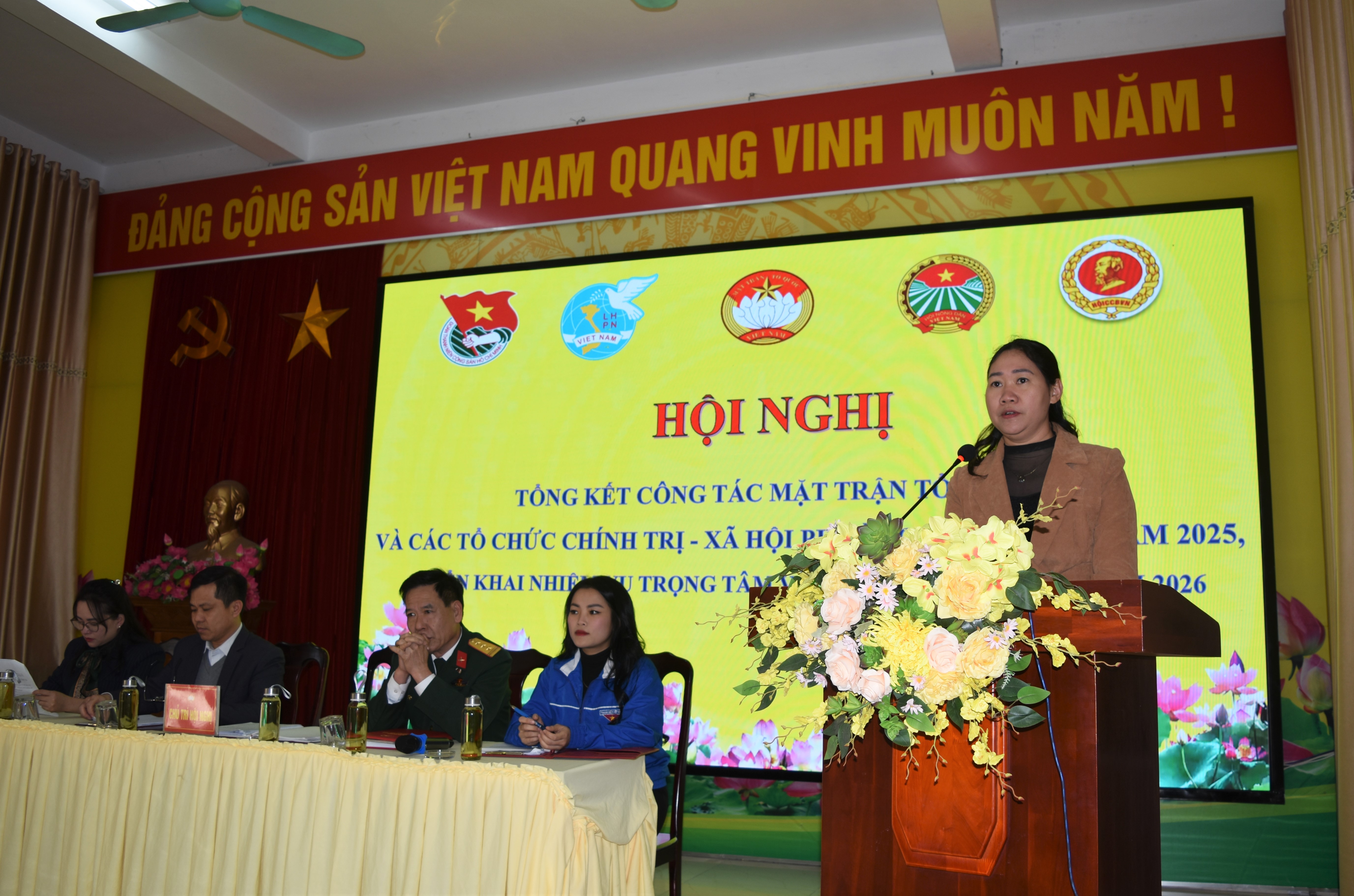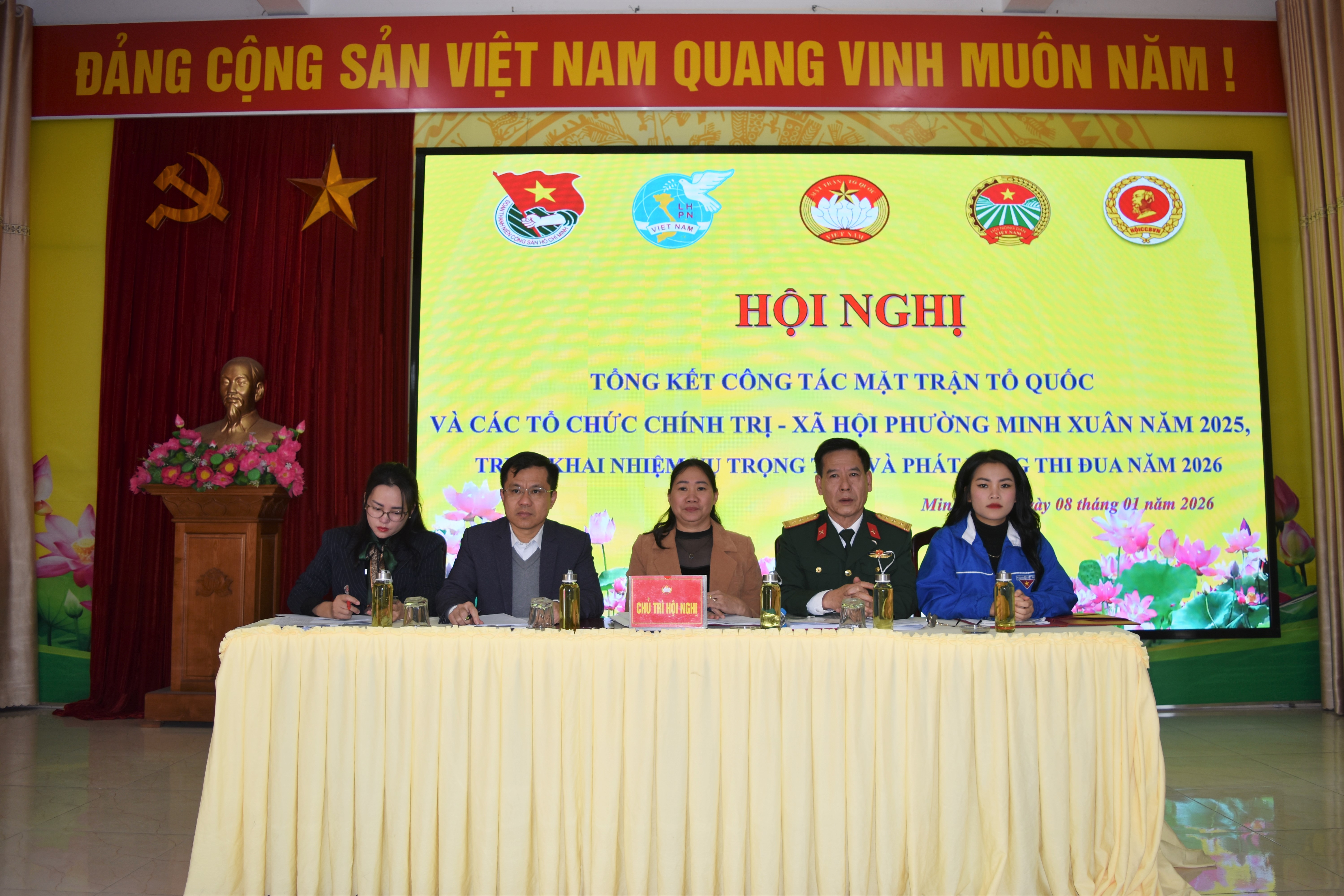 Dự và phát biểu chỉ đạo, đồng chí Phó Bí thư Thường trực Đảng ủy phường Đinh Thị Thu Hà, đã ghi nhận những kết quả nổi bật mà Ủy ban MTTQ Việt Nam và các tổ chức chính trị - xã hội phường Minh Xuân đã đạt được trong năm 2025. Nhấn mạnh vai trò trung tâm của Mặt trận trong việc tập hợp, vận động nhân dân phát huy sức mạnh khối đại đoàn kết dân tộc, chăm lo đời sống vật chất và tinh thần của nhân dân. Đồng chí đề nghị trong thời gian tới, Ủy ban MTTQ và các tổ chức chính trị - xã hội phường Minh Xuân tiếp tục nâng cao chất lượng, đổi mới nội dung và phương thức hoạt động, phối hợp chặt chẽ với các tổ chức thành viên, phát huy vai trò giám sát phản biện xã hội, đảm bảo mọi ý kiến nguyện vọng của nhân dân được lắng nghe và phản ánh kịp thời; đồng thời tăng cường các phong trào thi đua các cuộc vận động lớn, góp phần thực hiện thắng lợi các nhiệm vụ chính trị phát triển kinh tế - xã hội địa phương. Trước mắt, tập trung tuyên truyền về Đại hội XIV của Đảng và bầu cử đại biểu Quốc hội khoá XVI và đại biểu HĐND các cấp nhiệm kỳ 2026-2031.